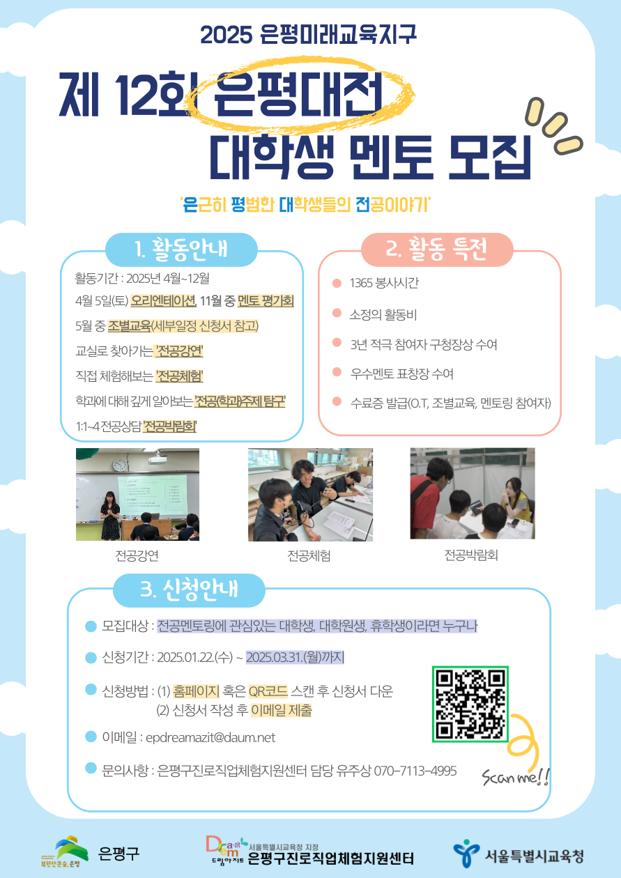 은평구진로직업체험지원센터에서 전공 멘토링에 관심있는 대학생 멘토를 모집하고 있습니다.