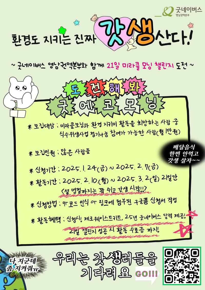 - 신청은 포스터내 QR코드 또는 구글폼 링크를 누르시면 굿에코모닝 신청서 칸으로 이동합니다.