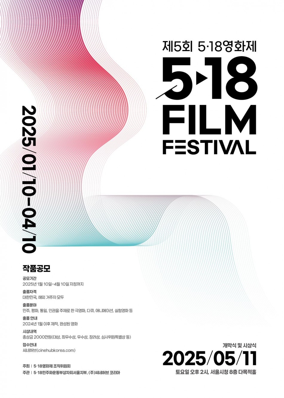 2025년 5.18 민주화운동이 45년 주년을 맞이하며 ‘5.18 민주화운동 부상자회 서울지부’와 ‘(주)씨네허브 컴퍼니’가 다섯 번째로 함께하는 ‘5.18 영화제’가 돌아왔습니다. 군부독재에 맞서 민주 정부 수립, 신군부 세력 퇴진 그리고 계엄령 철폐 등을 요구하며 전개된 5·18 운동은 대한민국의 민주주의 발전에 결정적인 역할을 했습니다. 5·18 영화제는 그 의미를 되새기고 그 정신을 이어가는 동시에 젊은 감독, 배우 등 영화인들을 지원하기 위해 개최하는 영화제입니다. 올해에도 영화인 여러분의 많은 참여와 함께 새로운 영화들과의 만남을 기대하겠습니다~