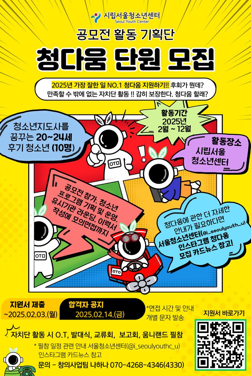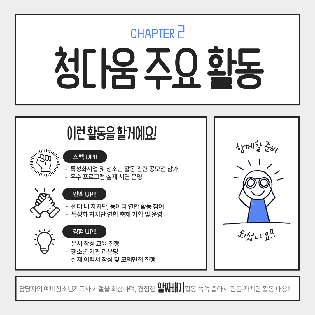 예비 청소년지도사를 대상으로 공모전에 참가하고, 다양한 프로그램 기획 및 운영 뿐만 아니라 유사 기관 라운딩과 이력서 작성, 모의면접까지 각종 청소년 활동의 알짜배기 요소를 쏙쏙 가져온 2025년 신규 자치단 '청다움' 단원을 모집합니다. 🎉