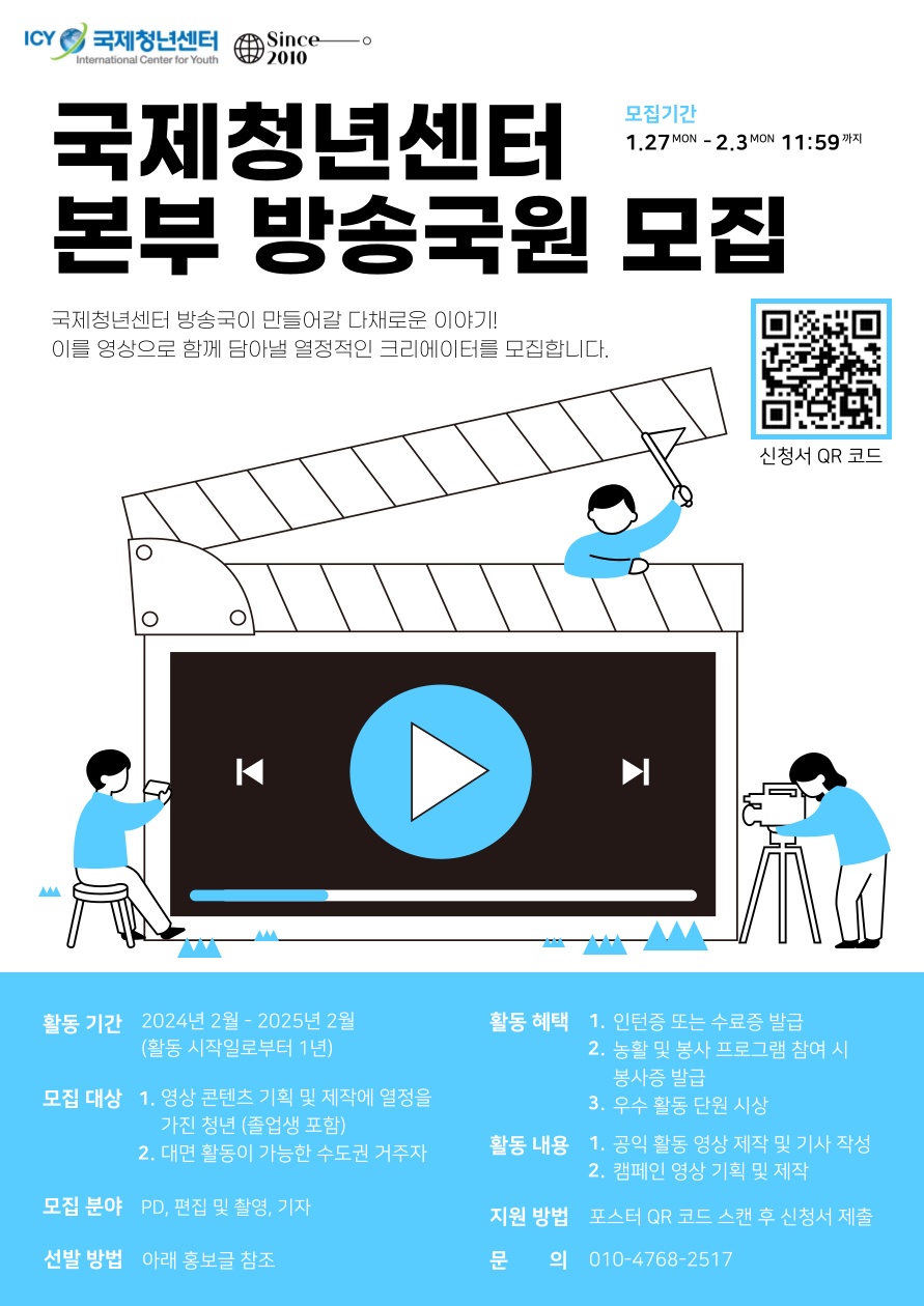 국제청년센터 본부 방송국에서 유튜브 TV 에 업로드 될 프로젝트를 진행 할 촬영, 편집에 재능있는 청년을 모집합니다!