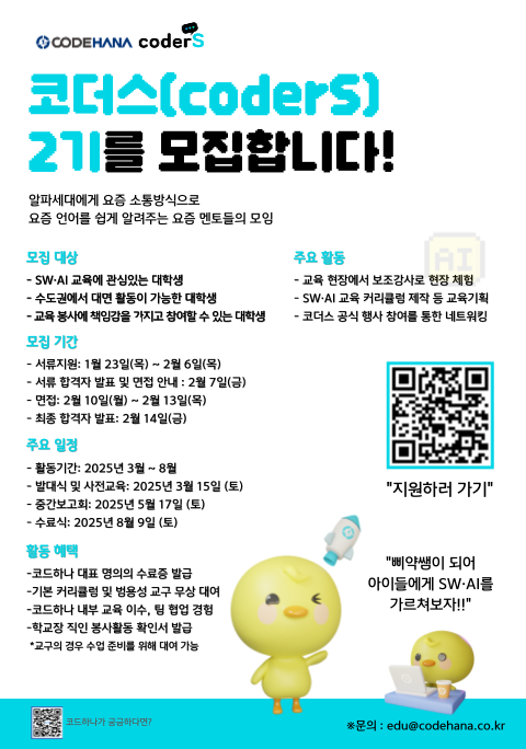(주)코드하나에서 SW·AI 교육서포터즈 코더스(coderS) 2기를 모집합니다.