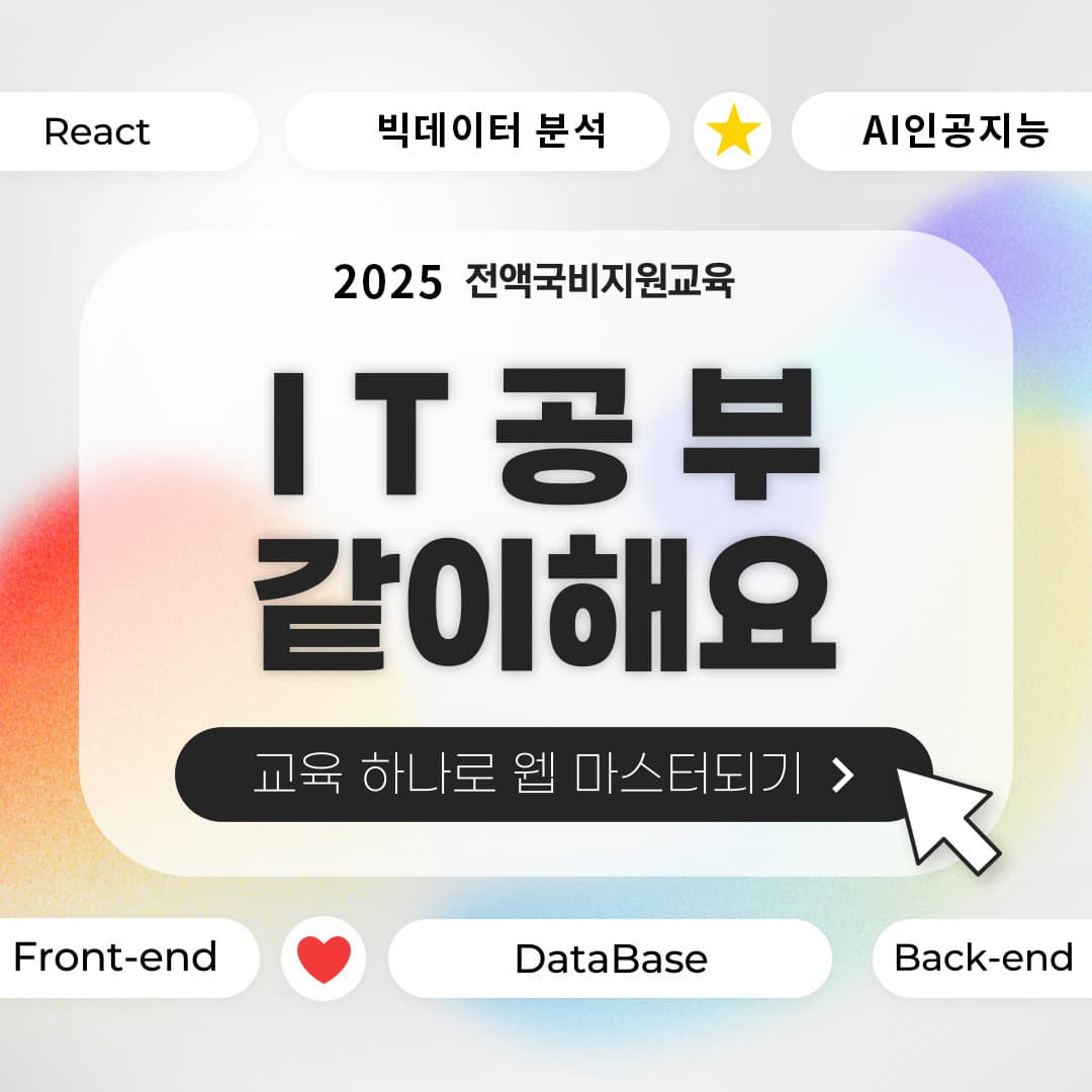 실무 중심 IT 전문가로 성장할 수 있는 최고의 기회! 빅데이터, AI, 클라우드, 풀스택 개발 기술을 마스터하고 2025년 새로운 커리어를 시작하세요.