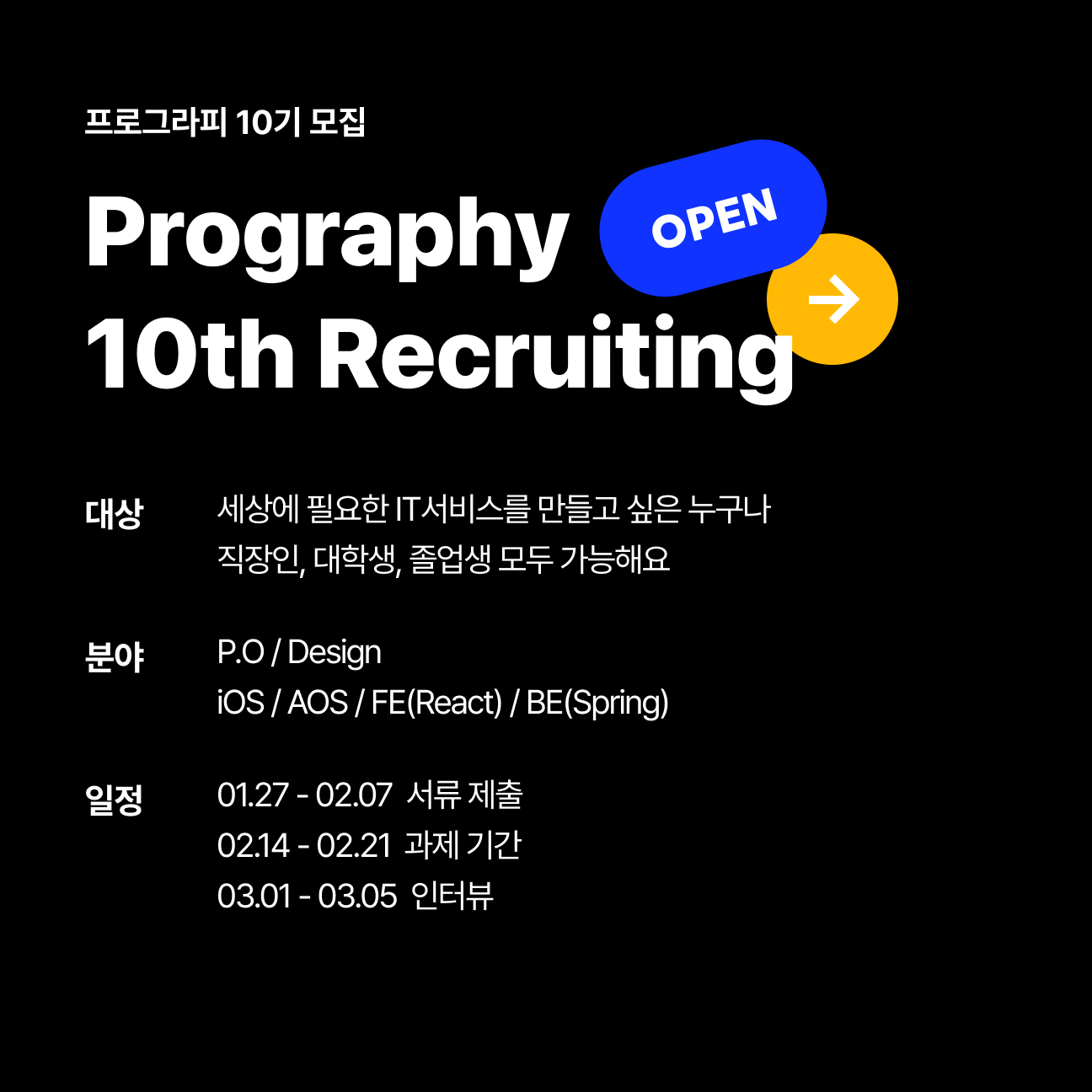 지원 방법: https://prography-admin.notion.site/apply-prography10 사이트에서 ‘지원서 작성하기’ 탭 클릭해 작성