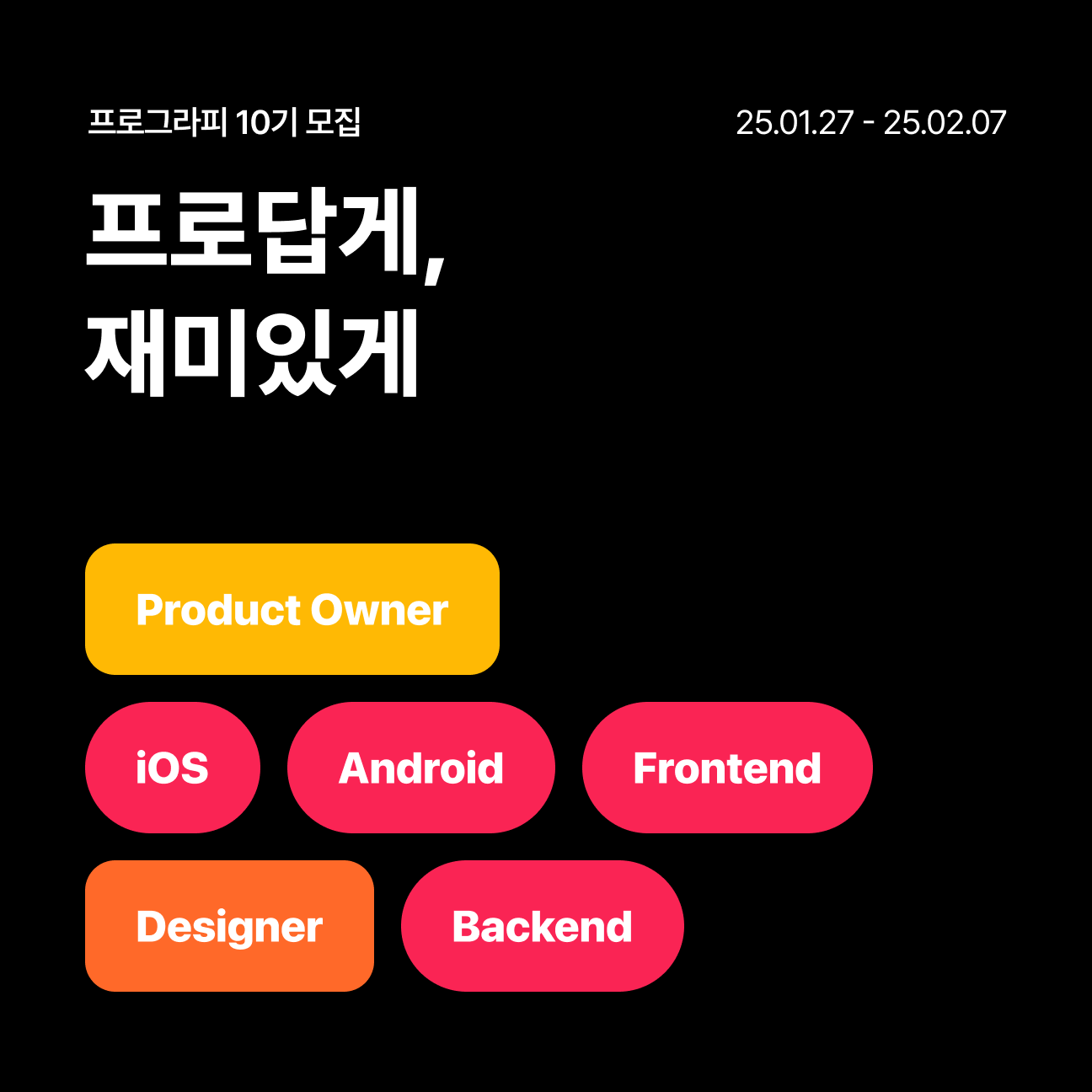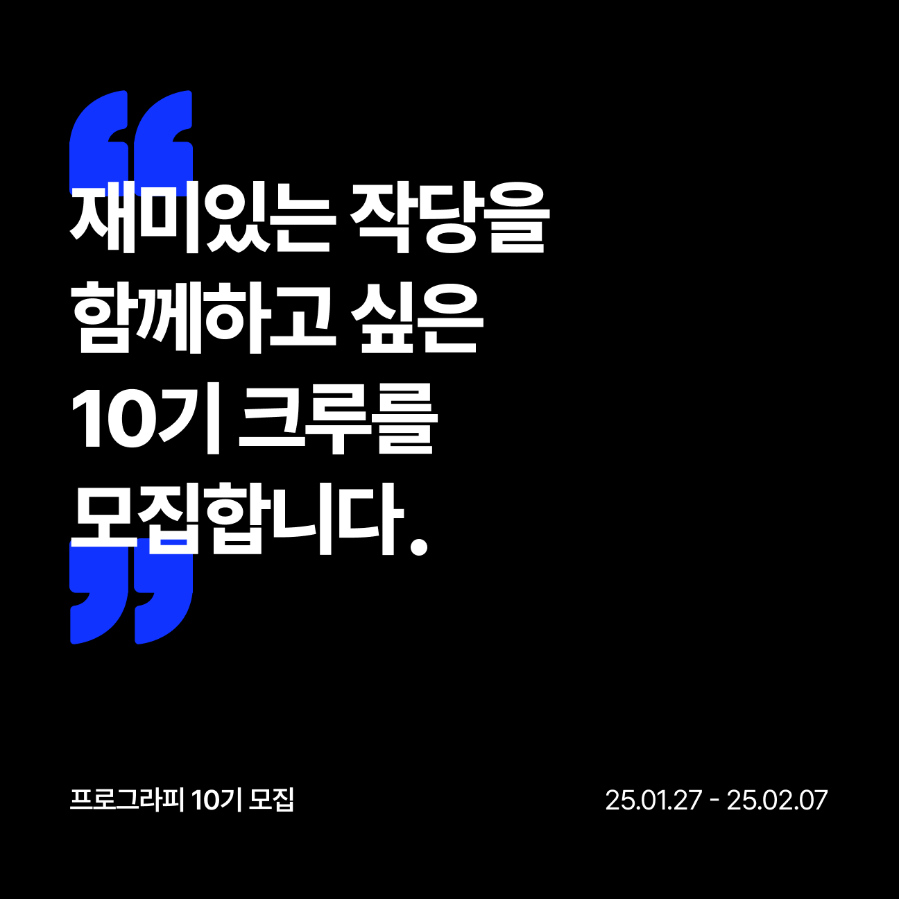 새로운 가치를 만들어가는 IT커뮤니티, 프로그라피에서 재미있는 작당을 함께할 10기 크루를 모집합니다. P.O와 디자이너, 개발자가 한 팀을 이뤄 보다 완성도 높은 프로덕트를 만들어갈 예정이죠.