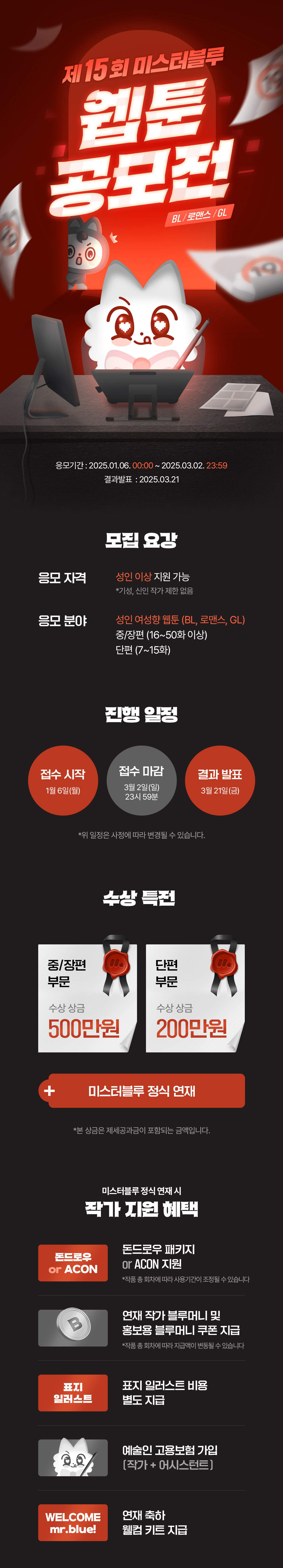 - 수상작 상금 지급 및 미스터블루 정식연재 기회 제공