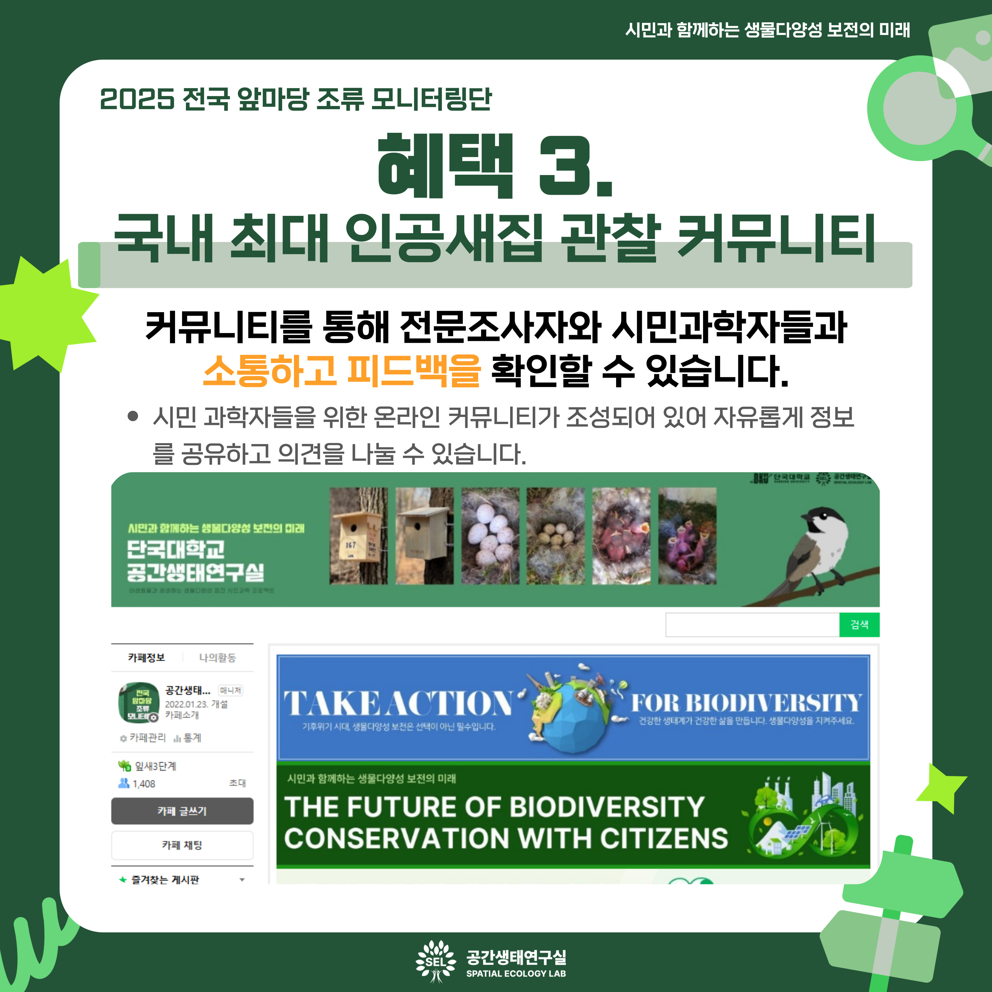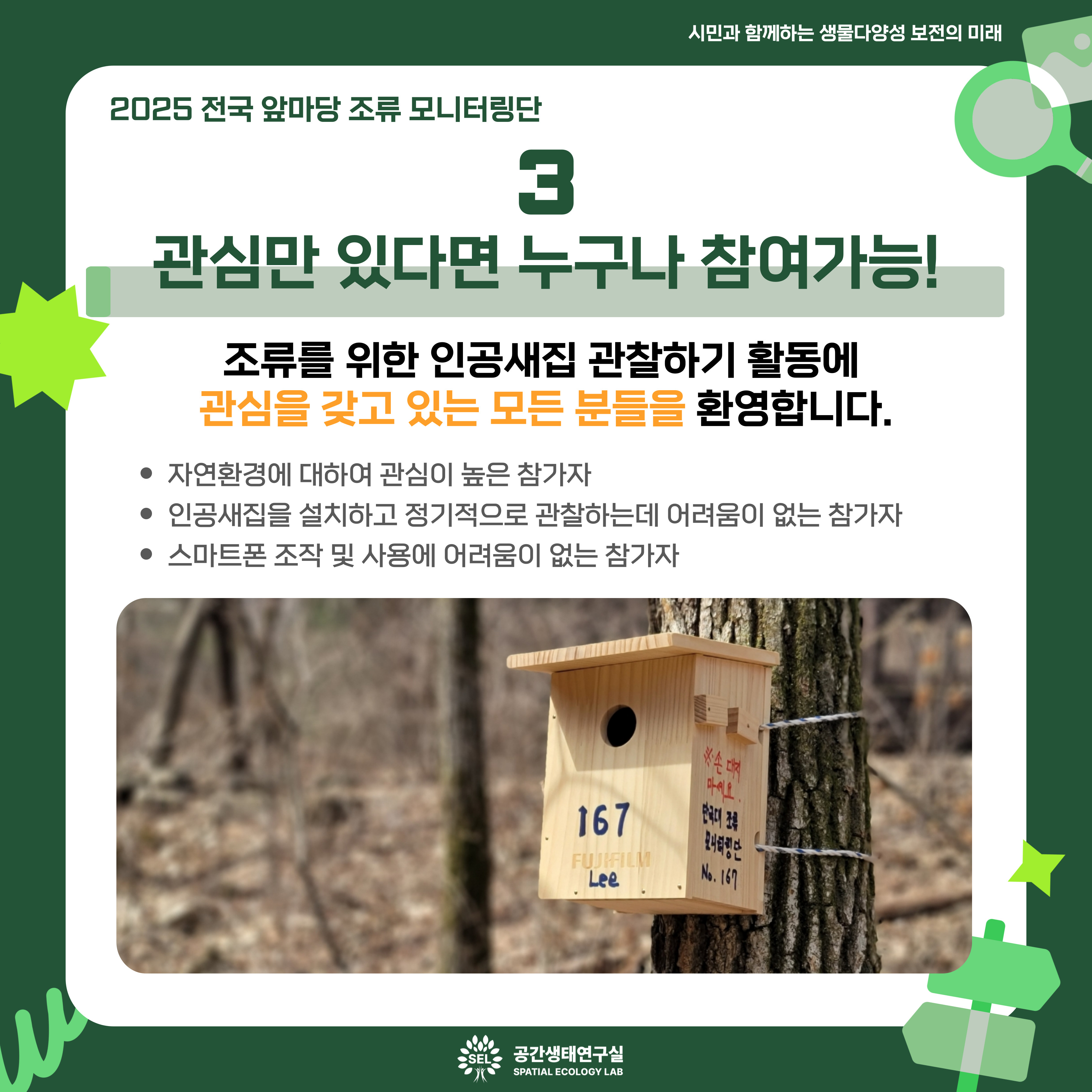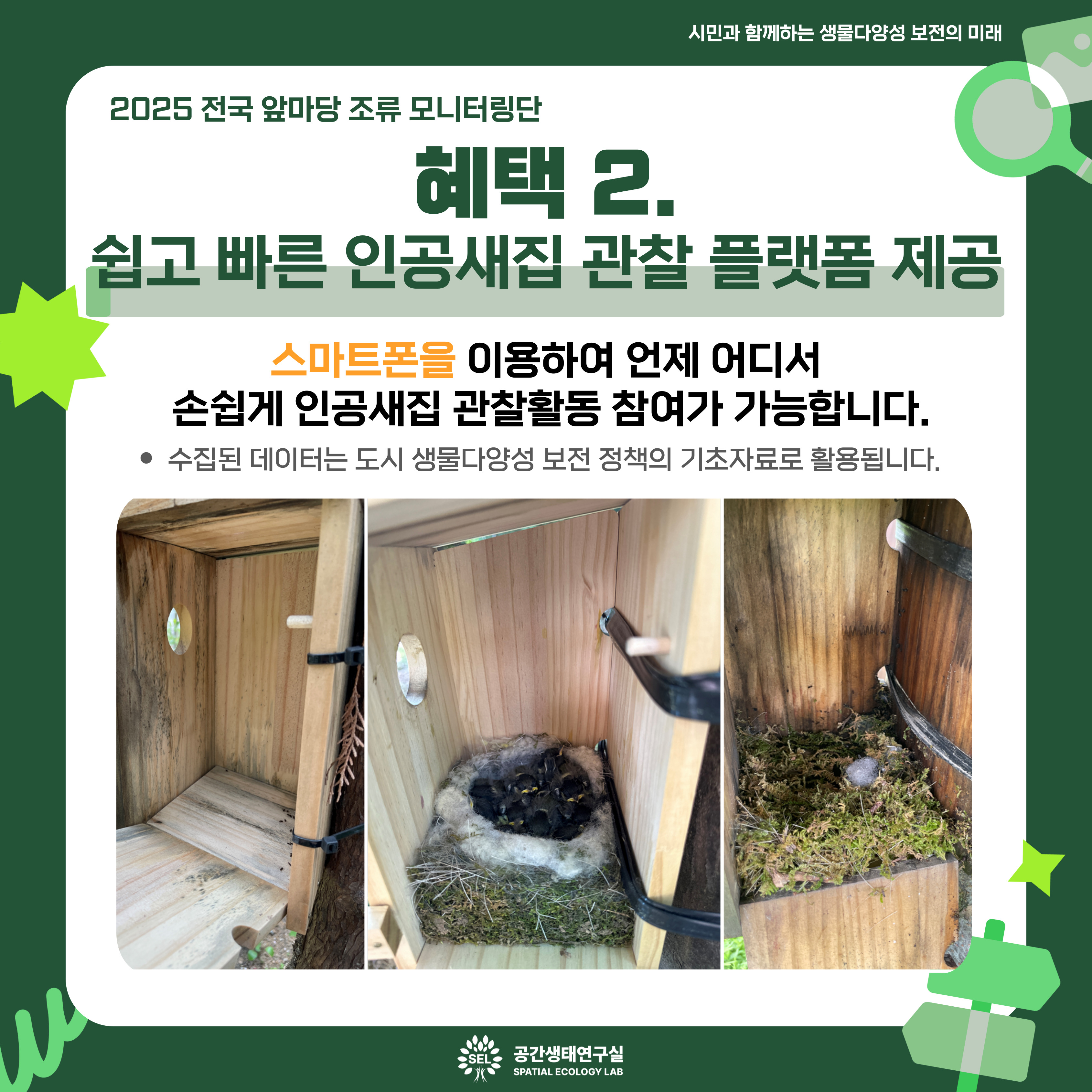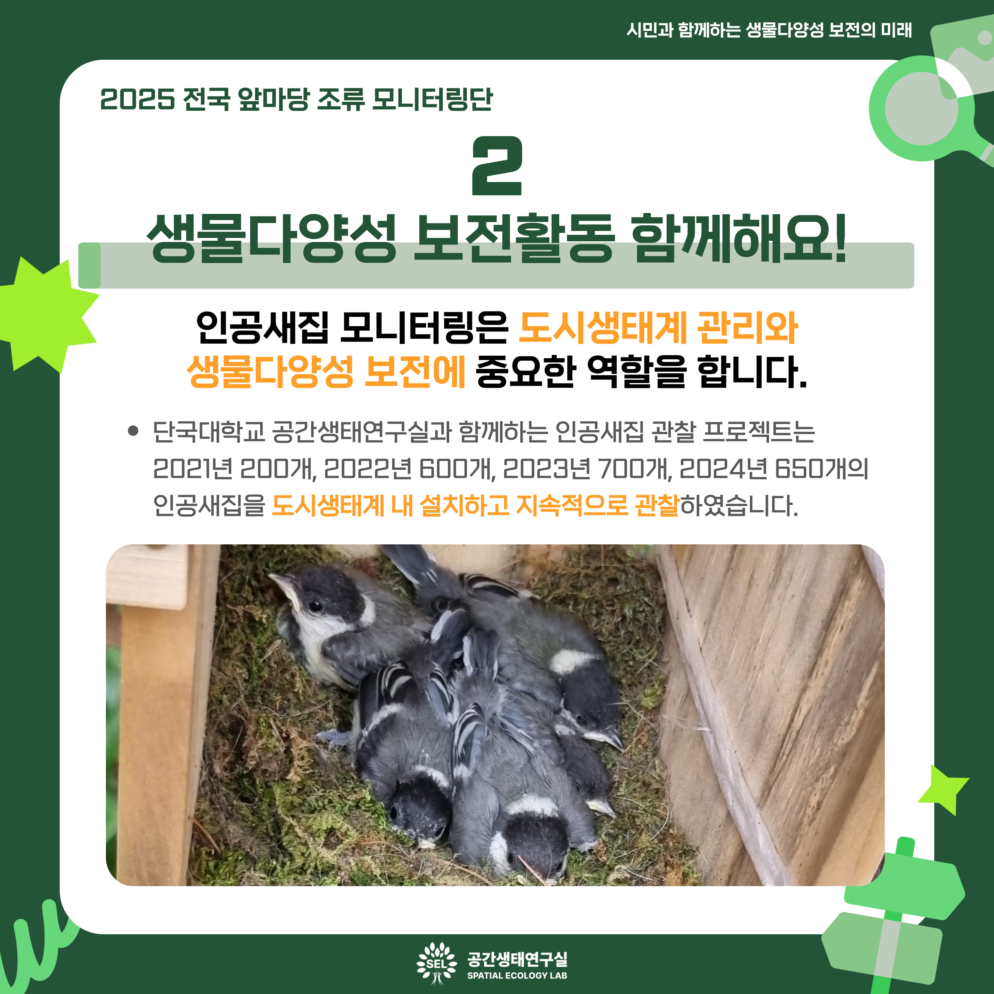 🟢 단국대학교 공간생태연구실에서 운영하는 「2025 전국 앞마당 조류 모니터링단」은 도심 속 번식지가 부족한 박새, 곤줄박이 등의 소형 조류를 위해 인공새집을 제공하고 이를 관찰하는 생물다양성 증진 프로젝트입니다.