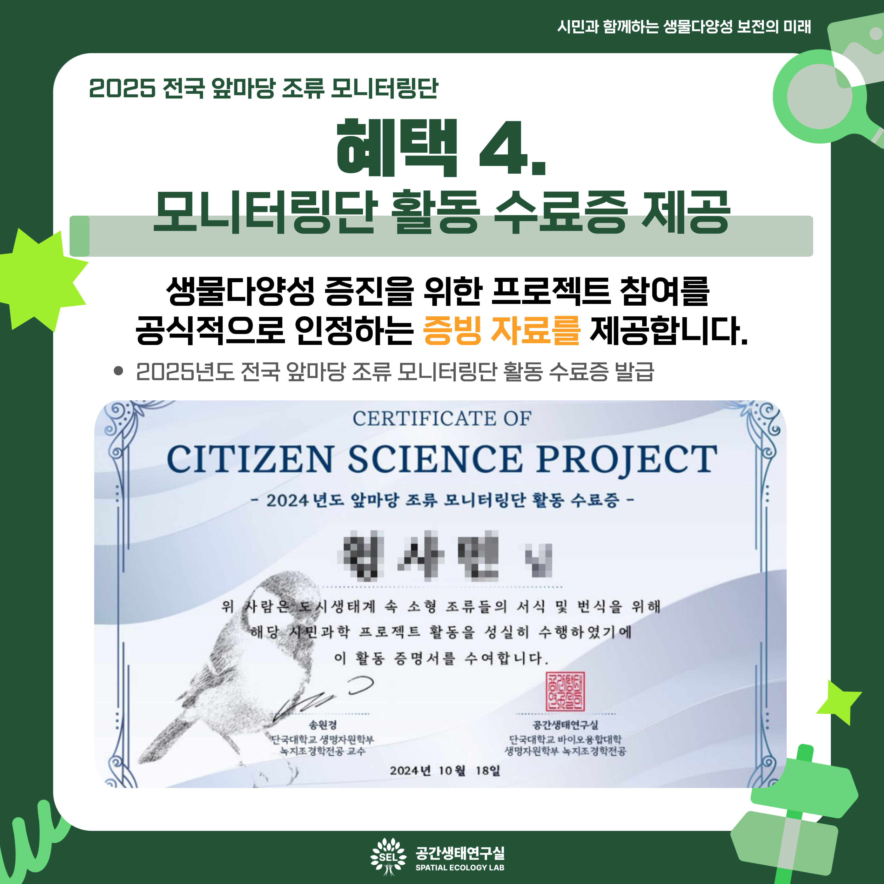 🟢 2025 전국 앞마당 조류 모니터링단 활동 수료증 발급