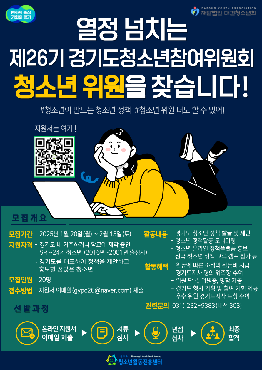 - ☏ 경기도청소년활동진흥센터 청소년협력팀 031) 232-9383 (내선303)