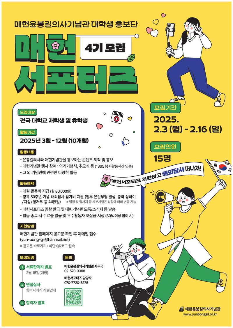 ❍ 지원방법 : 매헌기념관 홈페이지 공고문 확인 후 이메일 접수(yun-bong-gil@hanmail.net)
