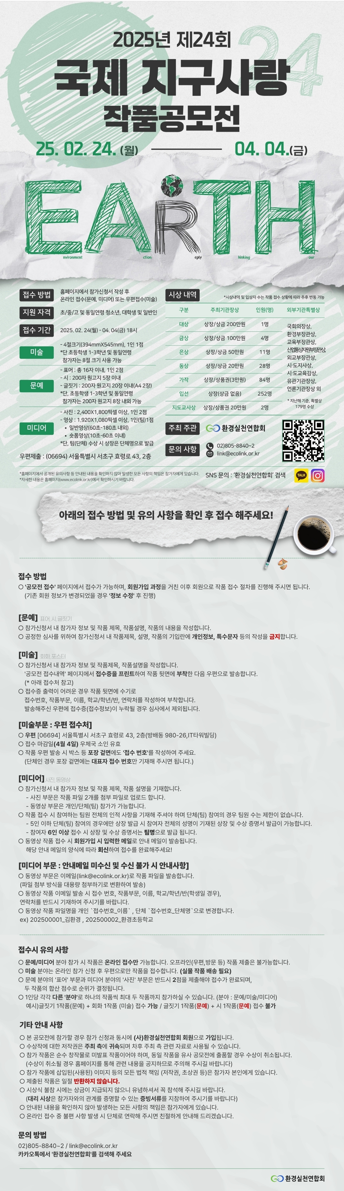 - 미디어 분야(영상) : 온라인 접수 후 접수번호, 작품명 기재하여 작품 첨부 후 이메일 전송(link@ecolink.or.kr)