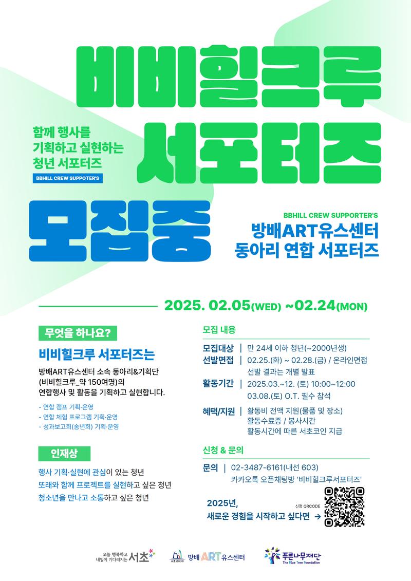 방배ART유스센터 소속 동아리&기획단(비비힐크루_약 150여명)의 연합행사 및 활동을 기획하고 실현하는 서포터즈입니다.