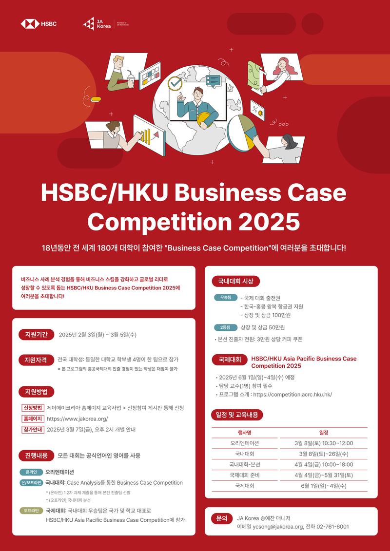 - (오프라인) 국제대회: 국내대회 우승팀은 국가 및 학교 대표로 HSBC/HKU Asia Pacific Business Case Competition에 참가