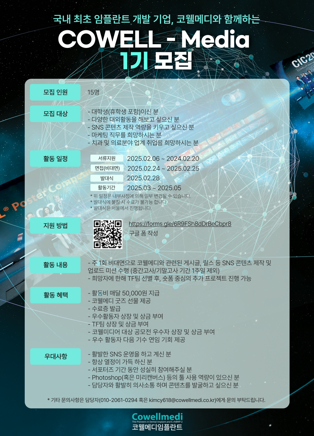 "국내 최초 임플란트 개발 기업, 코웰메디와 함께 특별한 경험을 쌓아보세요!"