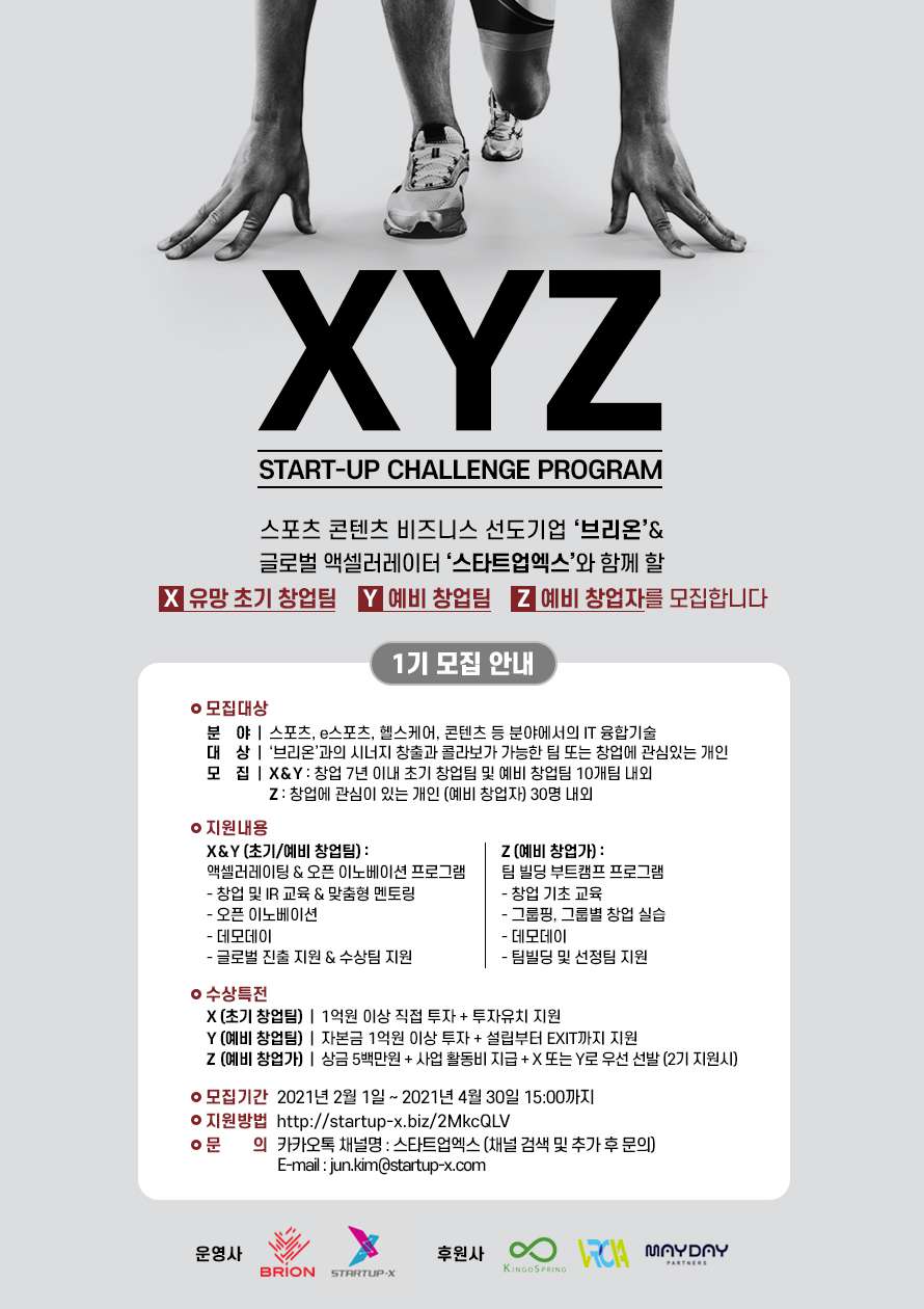 XYZ Program은 'BRION'과 'STARTUPX"가 공동운영하는 X액셀러레이션&Y오픈이노베이션&Z부트캠프 프로그램입니다. 글로벌 강국 e스포츠와 야구와 축구 등 기존 스포츠의 선순환 구조를 만든 국내 유일의 기업 'BRION'과, 글로벌 기업들과 새로운 오픈이노베이션을 통해 임팩트 스타트업 생태계를 이끄는 액셀러레이터 'STARTUPX'가 함께 창업자분들을 지원합니다.