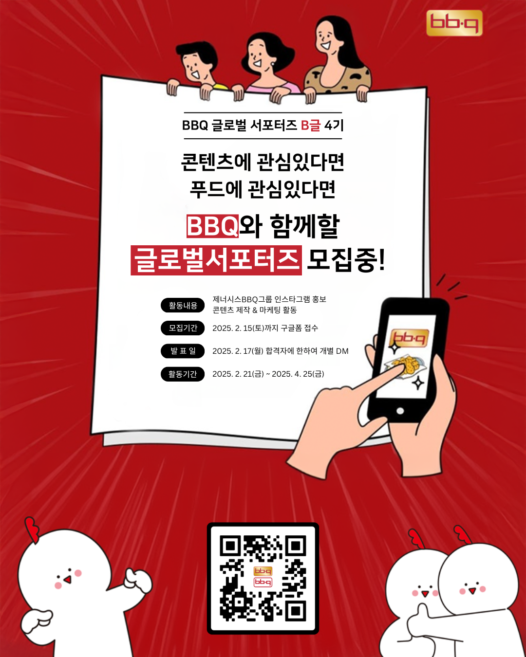 글로벌 1위 K-치킨 브랜드로서, 이미 전세계 63개국에서 K-푸드의 선두주자로 달리고 있는 BBQ! 제너시스BBQ그룹과 함께 K-푸드의 글로벌 앰배서더로 활약할 인스타 서포터즈 ‘B글 (비글)’ 4기를 모집합니다! (’B글’은 BBQ 글로벌 인스타 서포터즈의 약자이면서, ‘비글’처럼 유쾌하게 적극적으로 활약한다는 이중적인 의미를 갖습니다^^)