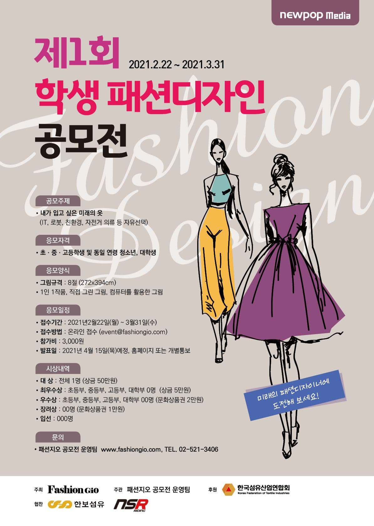 뉴팝미디어는 앞으로 K패션을 이끌어 갈 미래의 패션디자이너 양성을 위해 꿈과 상상력이 무궁무진한 학생들을 대상으로 월간 매거진 패션지오와 함께하는 ‘학생 패션디자인 공모전’을 개최합니다. 본 공모전을 통해 학생들에게 패션디자이너 세계의 간접적인 직업 체험의 기회를 제공하고자 하며, 코로나19로 인해 대외활동이 적은 학생들에게는 온라인 공모전으로 상상력과 창의력, 잠재되어 있는 재능을 마음껏 발휘할 수 있는 기회가 될 것입니다.