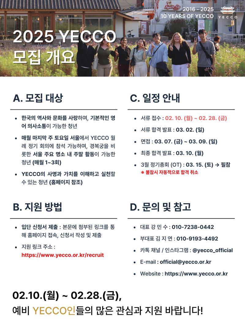 โ YECCO(Youth Exchanging Culture Communicatorโs Organization, ์์ฝ)๋ ํ๊ตญ์ ์ญ์ฌ์ ๋ฌธํ๋ฅผ ์ฌ๋ํ๋ ์ด์ ์ ์ธ ์ฒญ๋ , YECCO์ธ๋ค์ ๋ชจ์์ ๋๋ค.