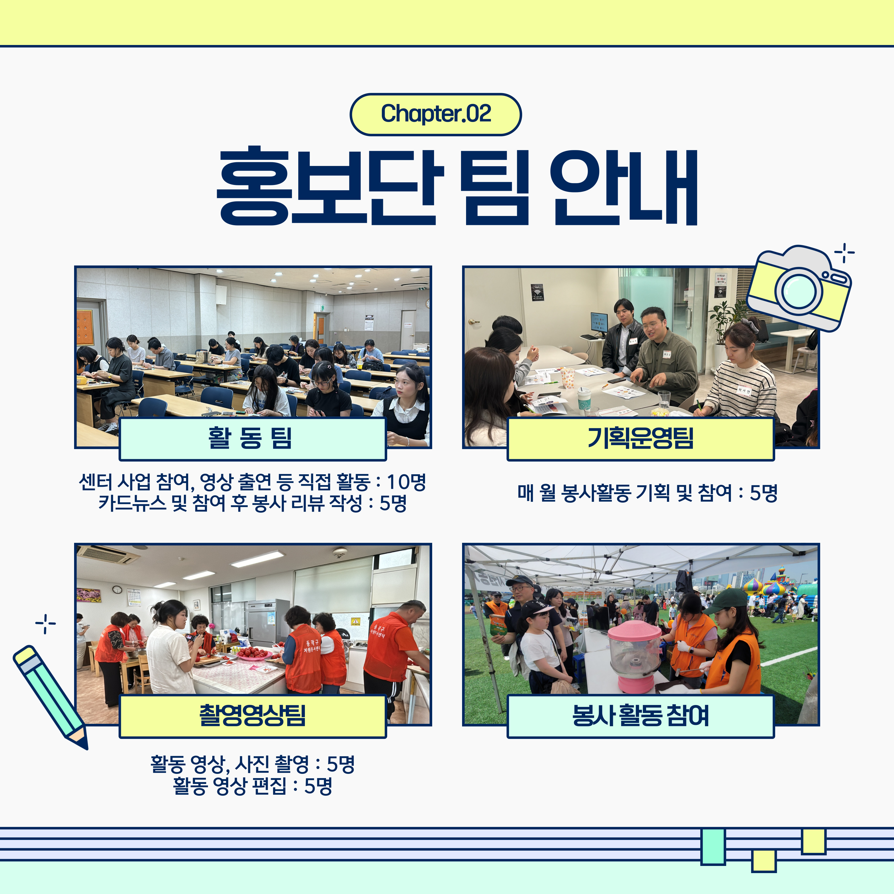 1. 활 동 팀 : 각종 캠페인 및 봉사 활동 참여, 영상 시나리오 구성