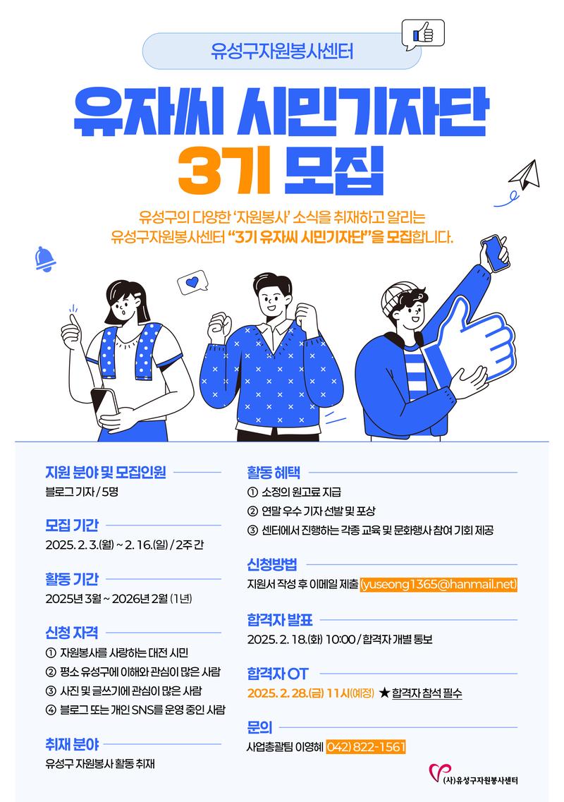 유성구자원봉사센터에서는 유성구 자원봉사 활동소식을 전해줄 3기 유자씨 시민기자단을 모집합니다.