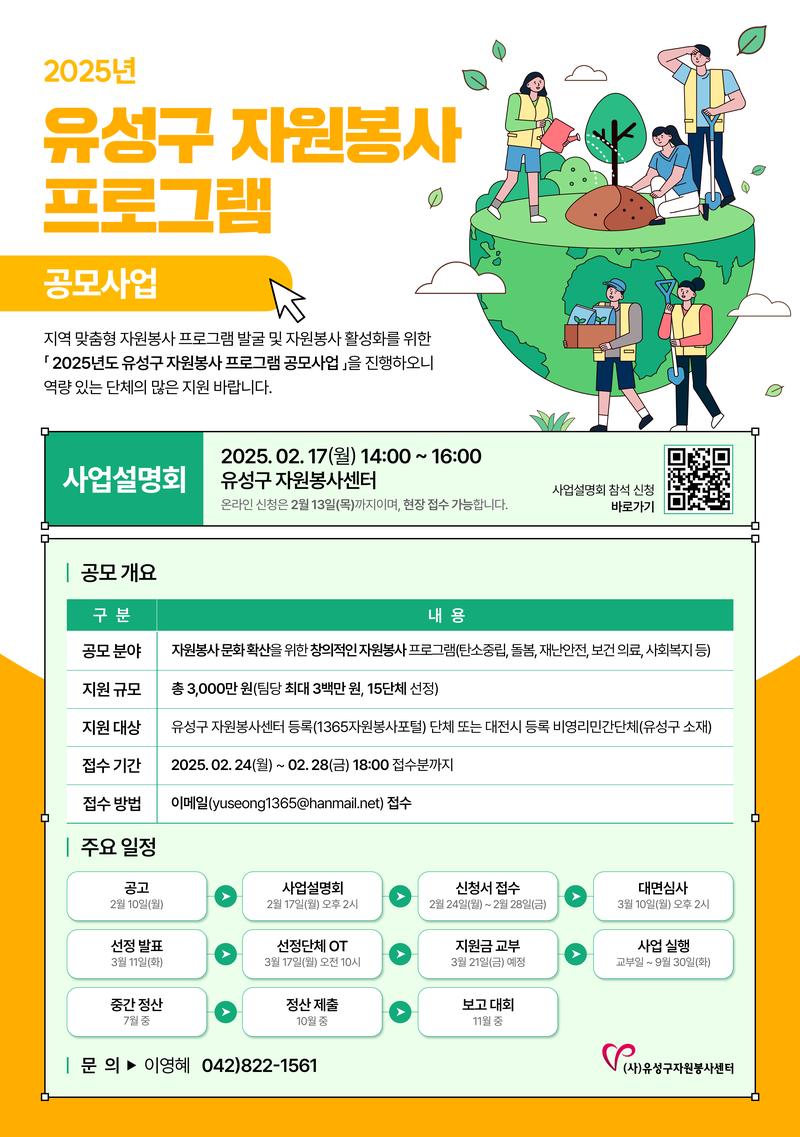 사업설명회: 2025. 2. 17.(월) 14:00-16:00 / 유성구자원봉사센터(대전 유성구 유성대로 730번길 51, 유성구지역협력센터 1층)