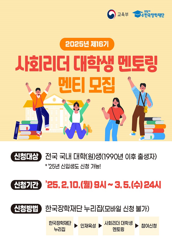 * 선발 제외 대상 ① 만 35세 이상 학생(1989년 이전 출생자) ② 기졸업자, '25년 2월 졸업생 ③ 사회리더 대학생 멘토링 4회 참여자