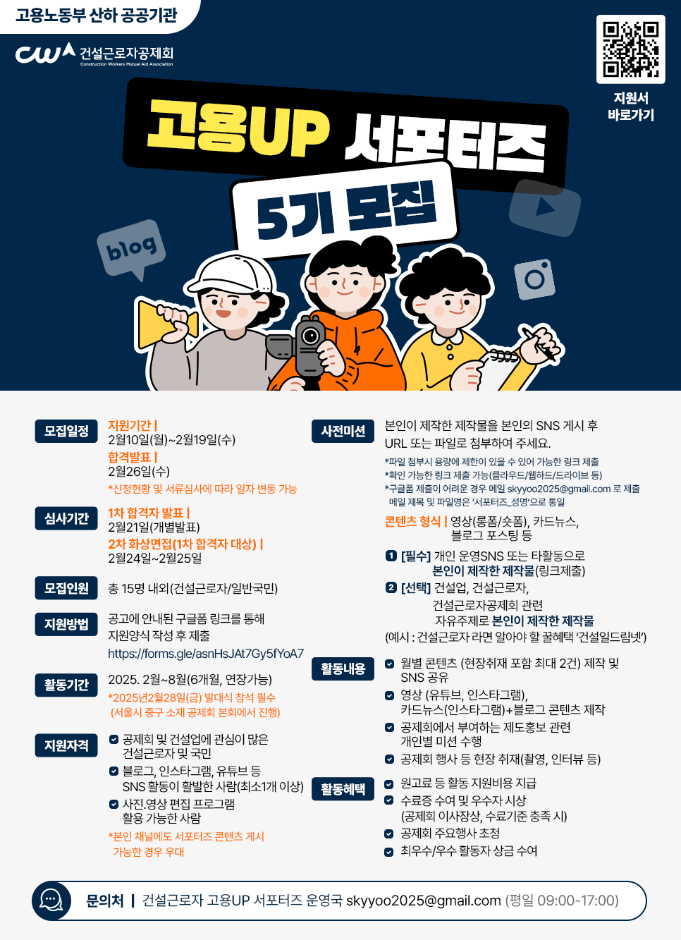 📢건설근로자공제회(고용노동부 산하 공공기관)와 함께 할 건설근로자 고용UP 서포터즈 5기를 모집합니다.
