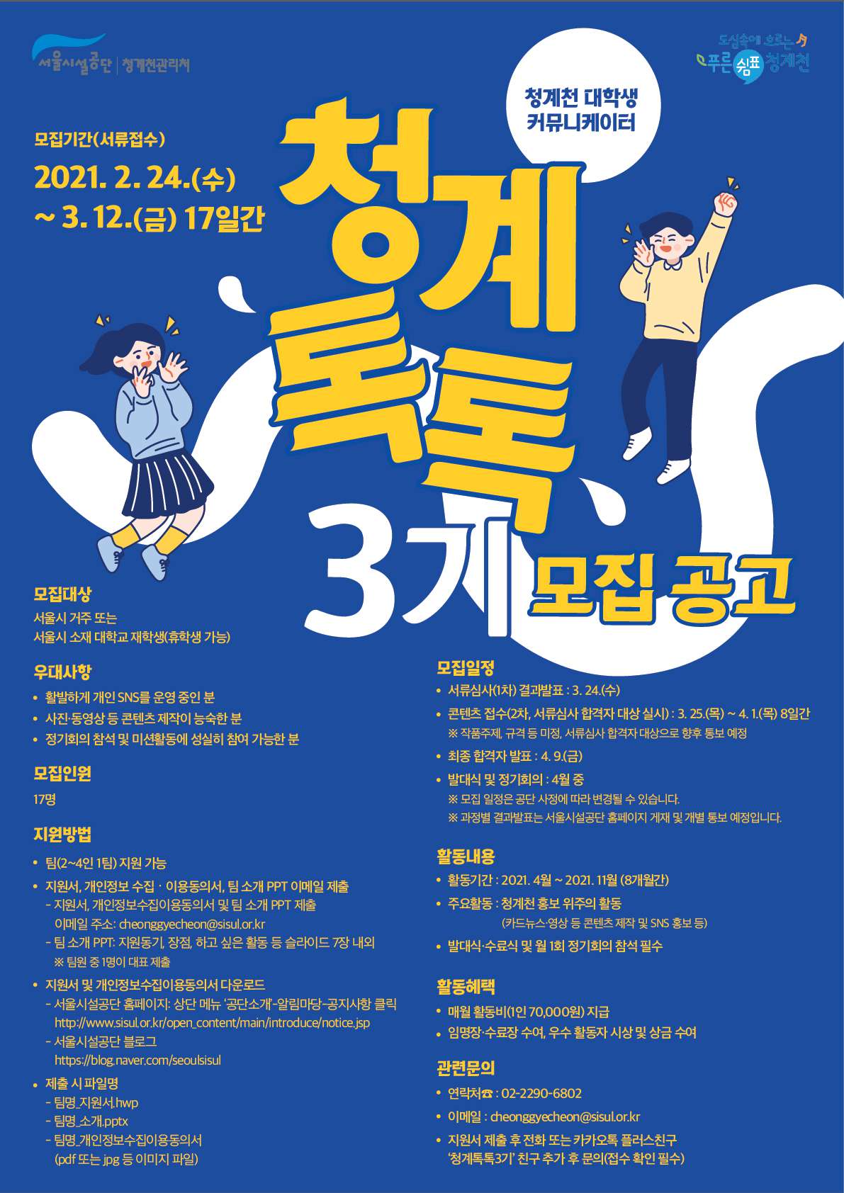 월별 미션 수행을 통하여 시민과 소통하고 청계천을 적극적으로 홍보할 수 있는 대학생 커뮤니케이터, ‘청계톡톡 3기’ 를 모집합니다.