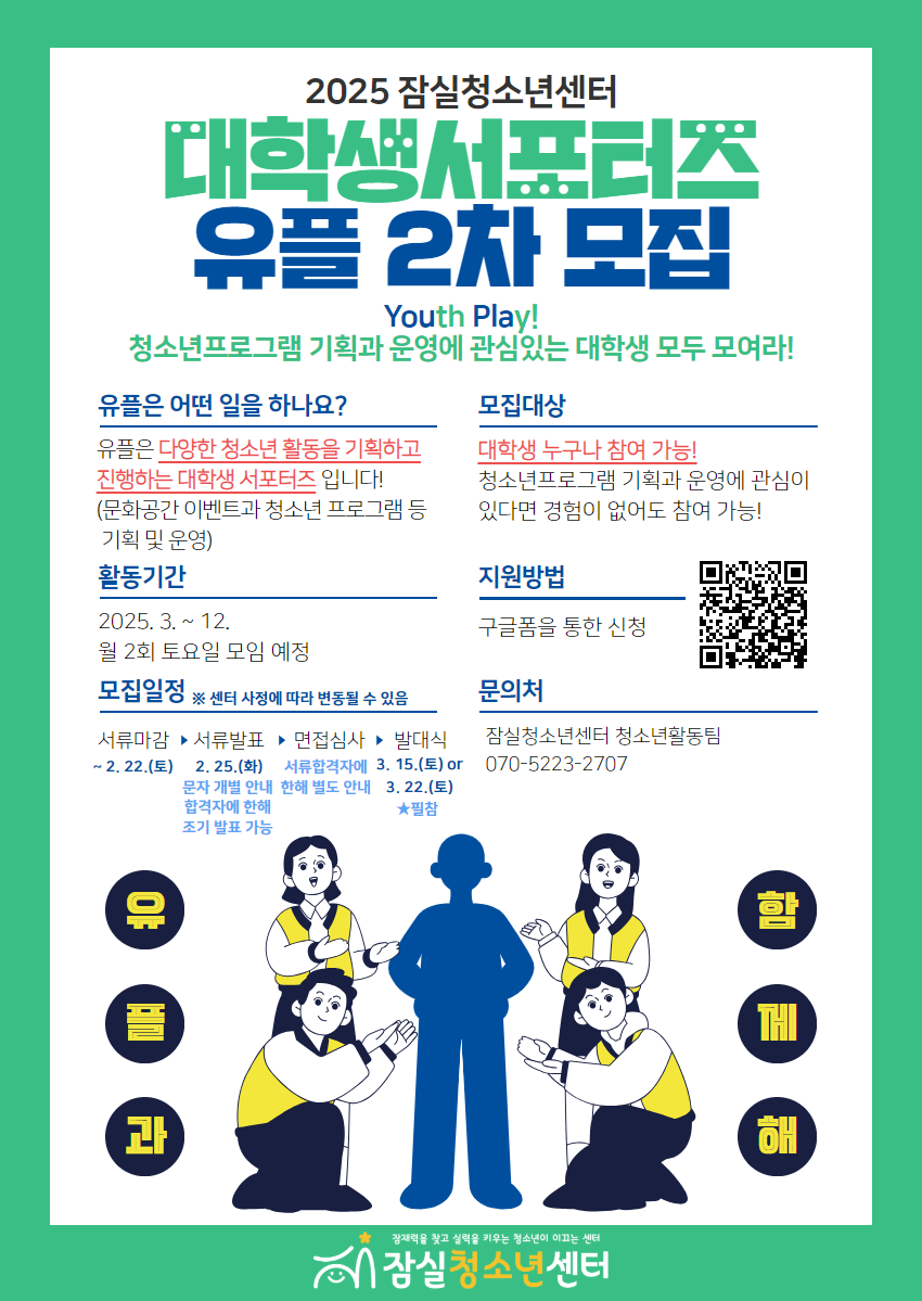 [2025년 잠실청소년센터 대학생 서포터즈 '유플' 단원 2차 모집]