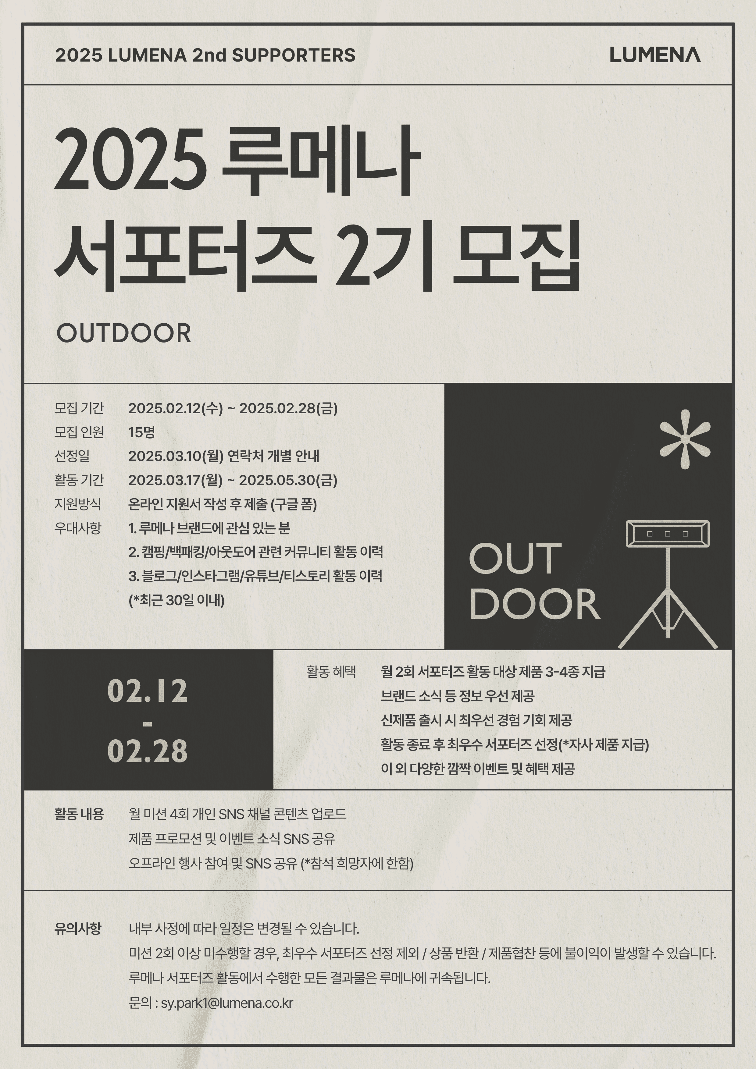 💁♀️캠핑/백패킹/낚시 등 나만의 OUTDOOR Life에 루메나의 감성을 더할 서포터즈를 찾습니다!