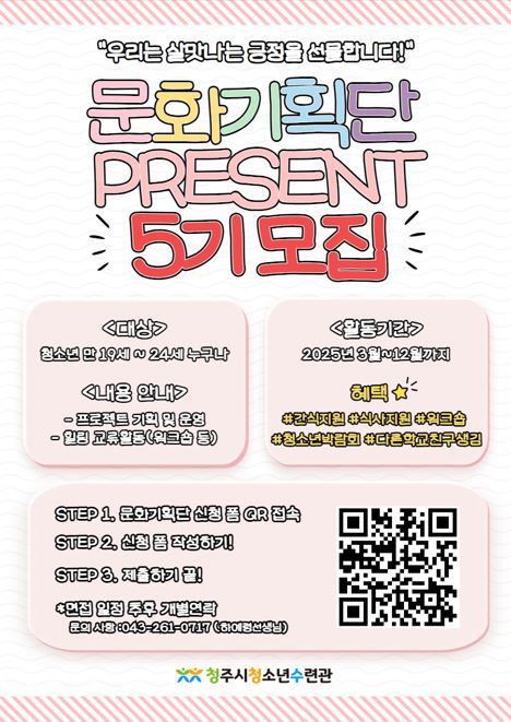 2025년 문화기획단 PRESENT 5기로 활동할 만19세~24세 대학생 청소년을 모집하고 있습니다!