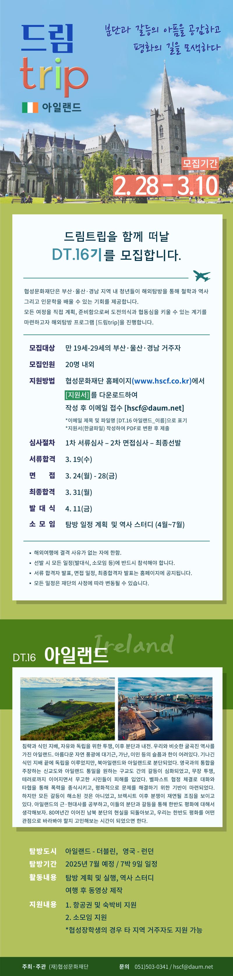 제목 : 협성문화재단 드림트립 DT.16 아일랜드 모집(항공권, 숙박비 지원)(~3/10)
