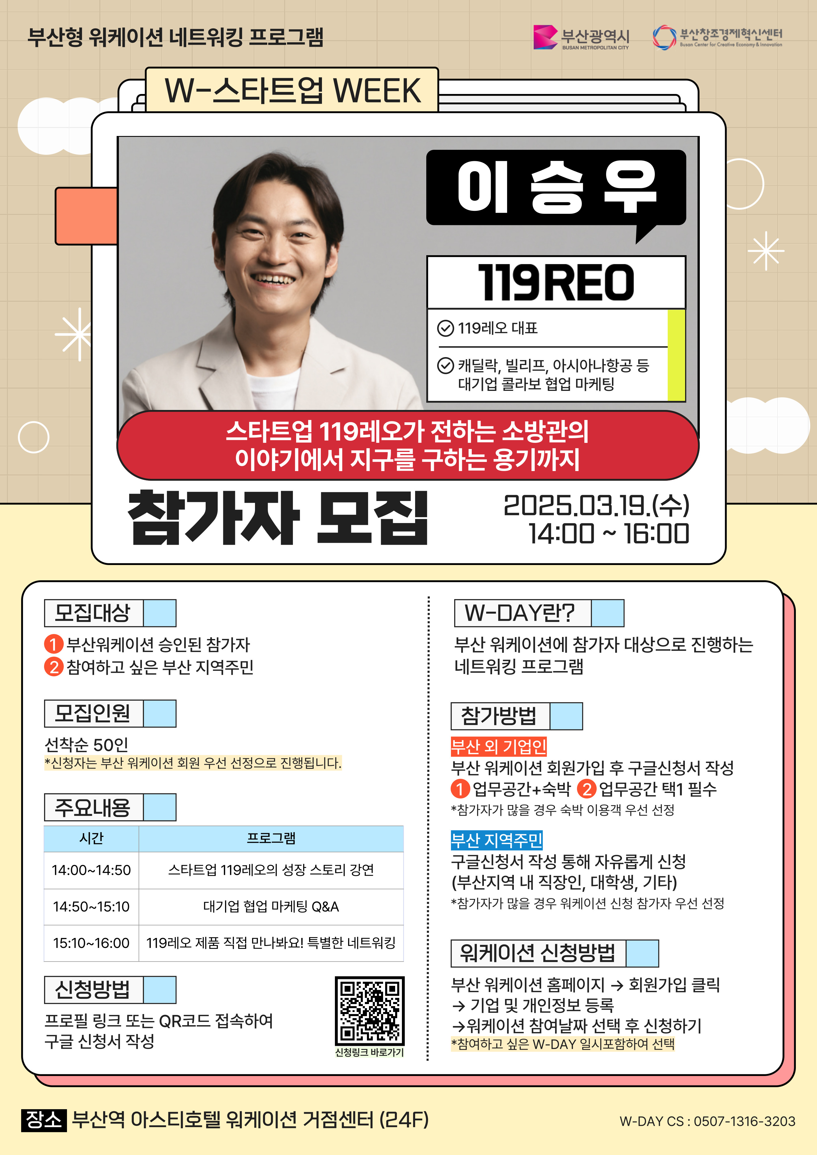 119레오 이승우 대표가 전하는 스타트업 119레오가 전하는 소방관의 이야기에서 지구를 구하는 용기까지. 캐딜락, 빌리프, 아시아나항공 등 대기업과의 협업 마케팅 경험부터, 폐방화복 업사이클링을 통해 사회적 가치를 창출하는 과정까지! 의미 있는 도전과 성장을 함께 나누는 시간, 놓치지 마세요. 또한 부산 워케이션을 위한 119레오만의 특별 전시!