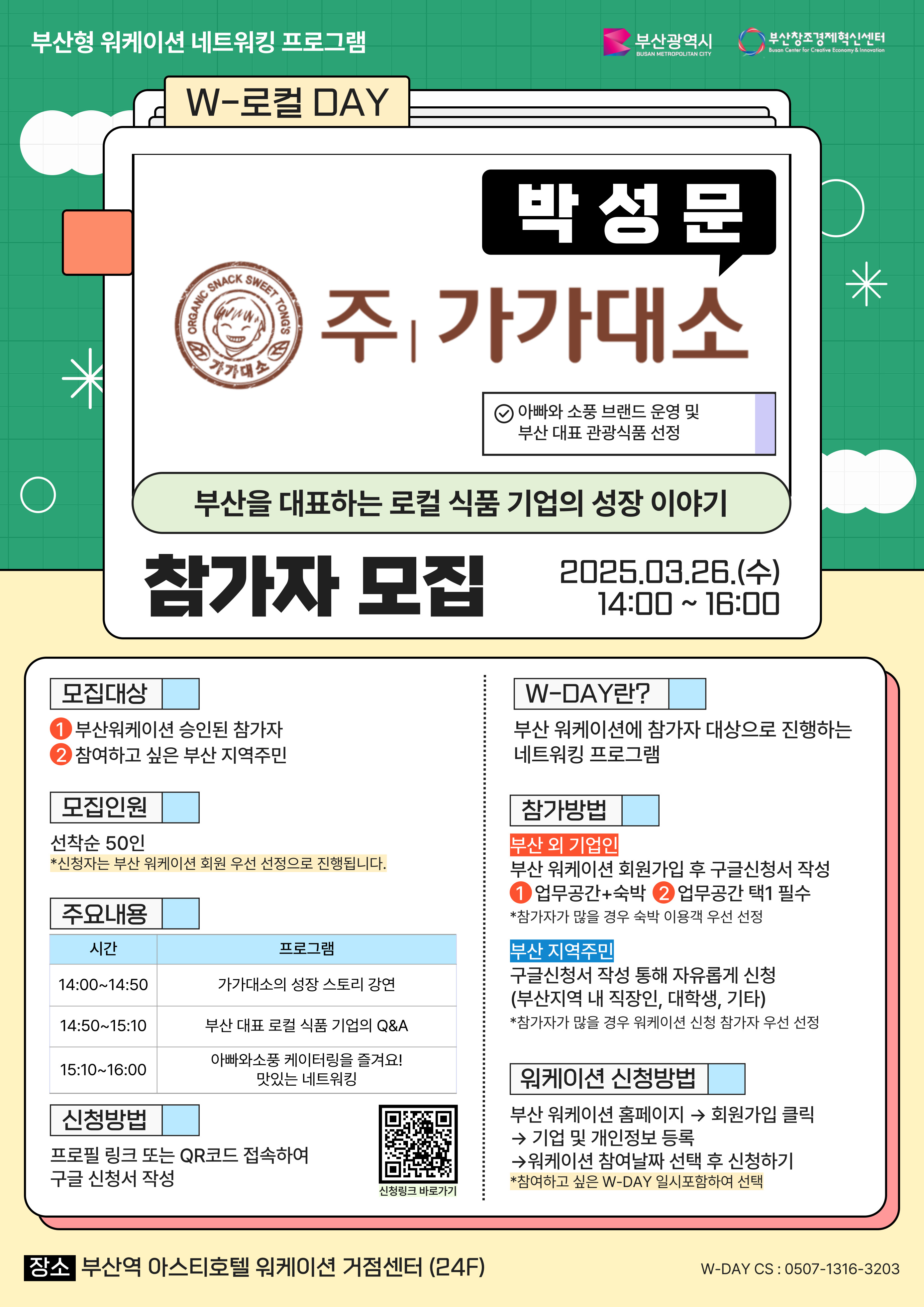 부산 대표 관광식품 브랜드 ‘아빠와 소풍’을 운영하는 가가대소 박성문 대표가 들려주는 성장 스토리! 지역 식품 브랜드가 어떻게 탄생하고, 전국으로 확장되었는지 직접 경험한 인사이트를 나눕니다. 강연 후에는 ‘아빠와 소풍’ 음식으로 케이터링을 즐기며 네트워킹하는 시간도 마련되어 있으니, 맛있는 이야기와 함께 뜻깊은 자리 가져보세요!