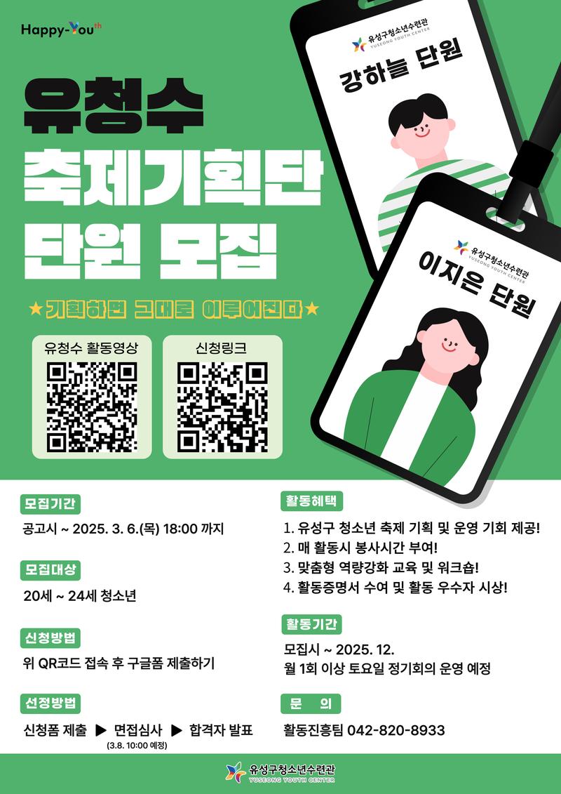 유성구청소년수련관에서 대학생들의 역량 강화와 프로그램 기획·운영의 기회를 제공하기 위해 제3기 축제기획단 신규 단원을 모집합니다!!!