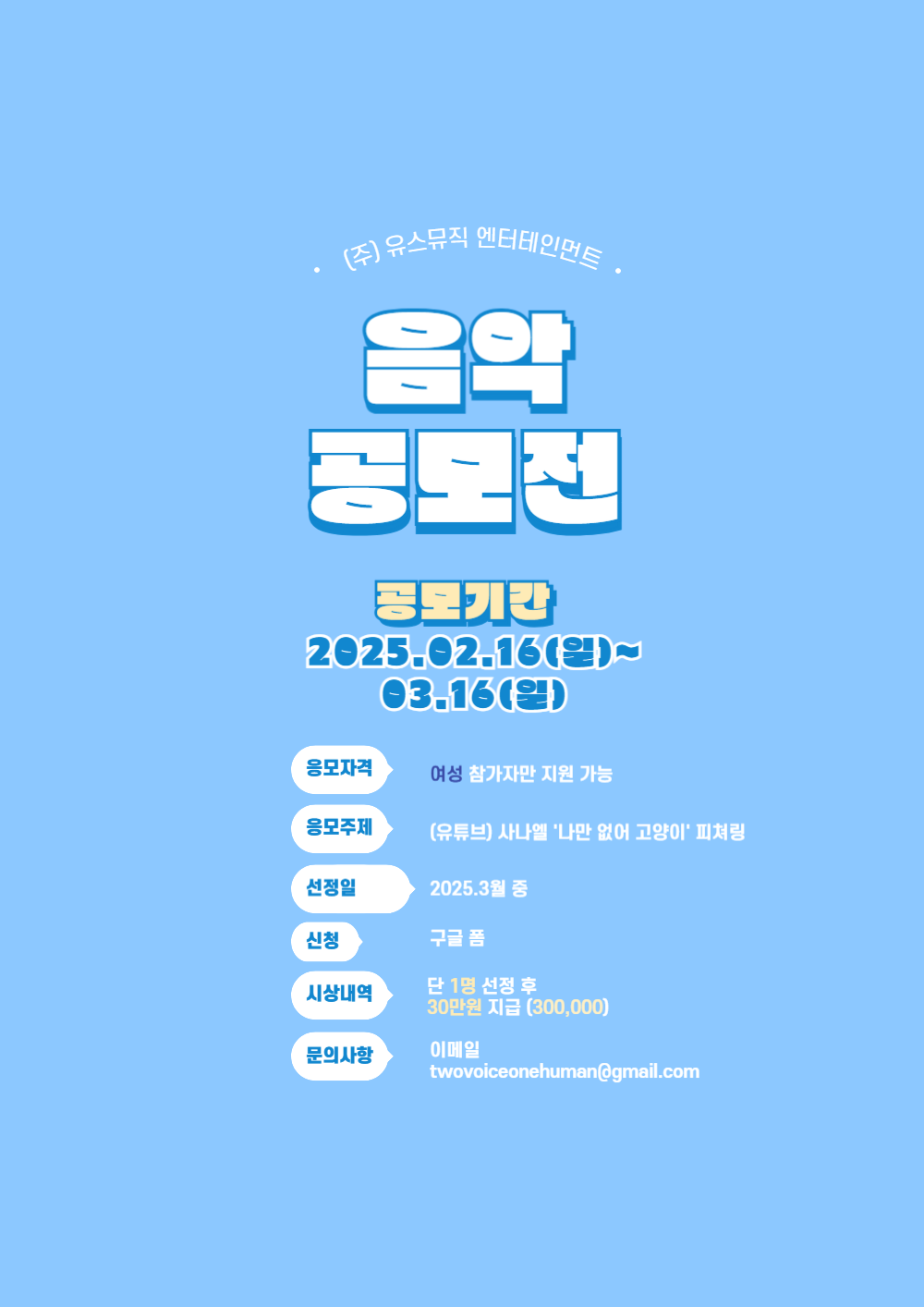 본 공모전은 (유튜브) 사나엘 채널의 '나만 없어 고양이' 정식 음원 발매를 위한 피쳐링 해주실 여성 아티스트분을 구하는 공모전입니다!