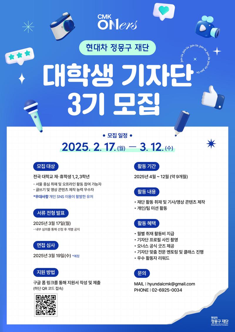현대차 정몽구 재단에서 대학생 기자단 CMK ONers(오너스 기자단) 3기를 모집합니다.