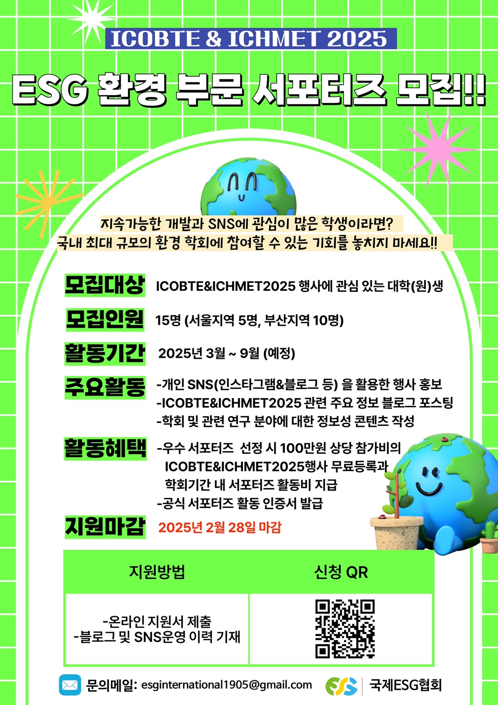 [ICOBTE & ICHMET 2025 국제 학회 한국 대학(원)생 서포터즈 모집]🌍♻️