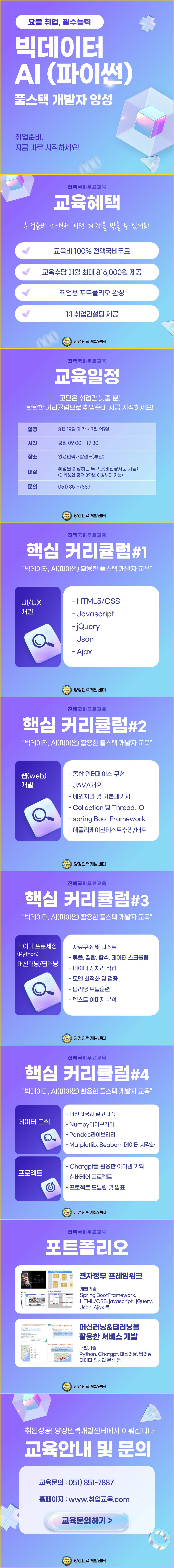 - 빅데이터 분석: 데이터 수집, 전처리부터 시각화까지 실무 능력 강화.