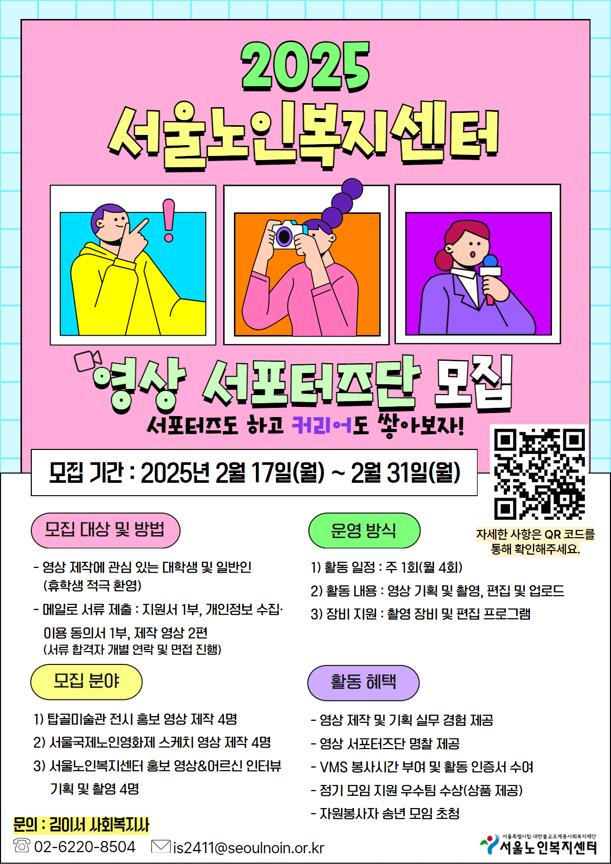 2) 이전 제작 영상 (포트폴리오) 1~2편과 함께 메일 제출 (is2411@seoulnoin.or.kr)