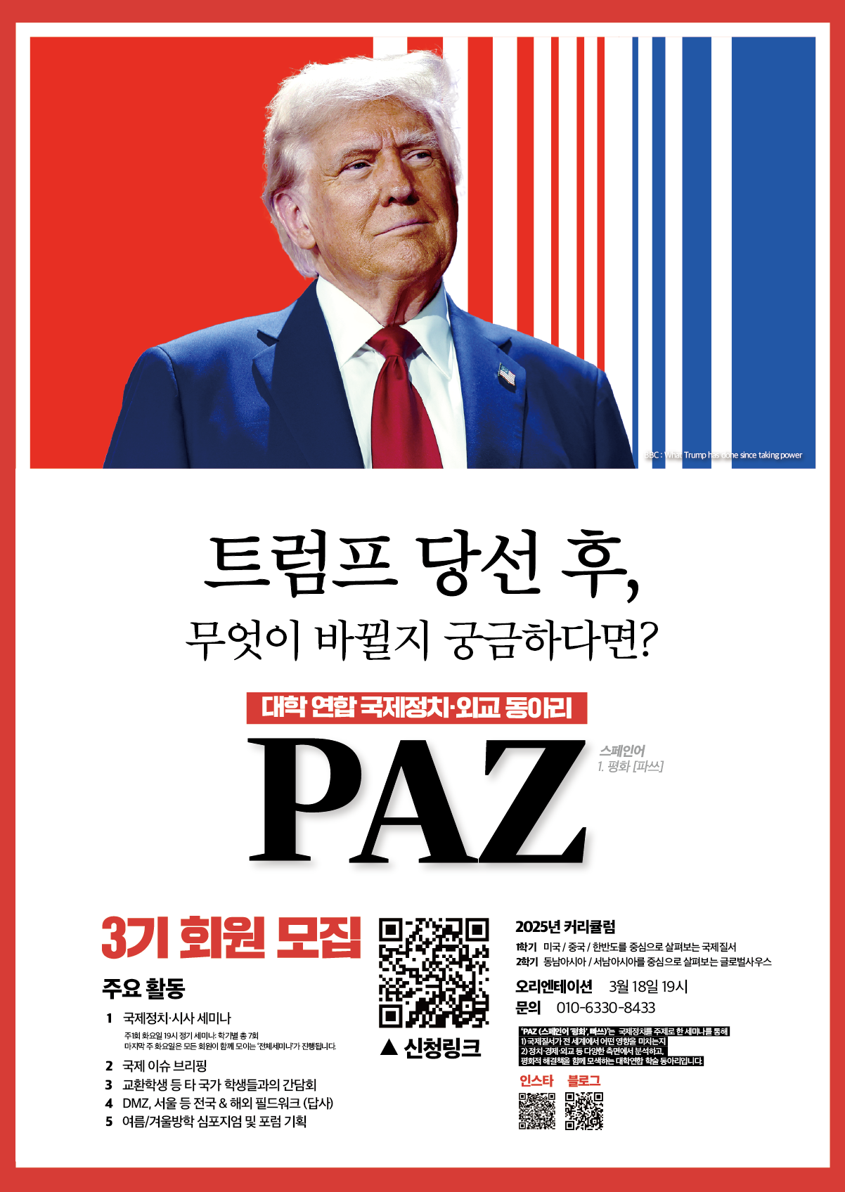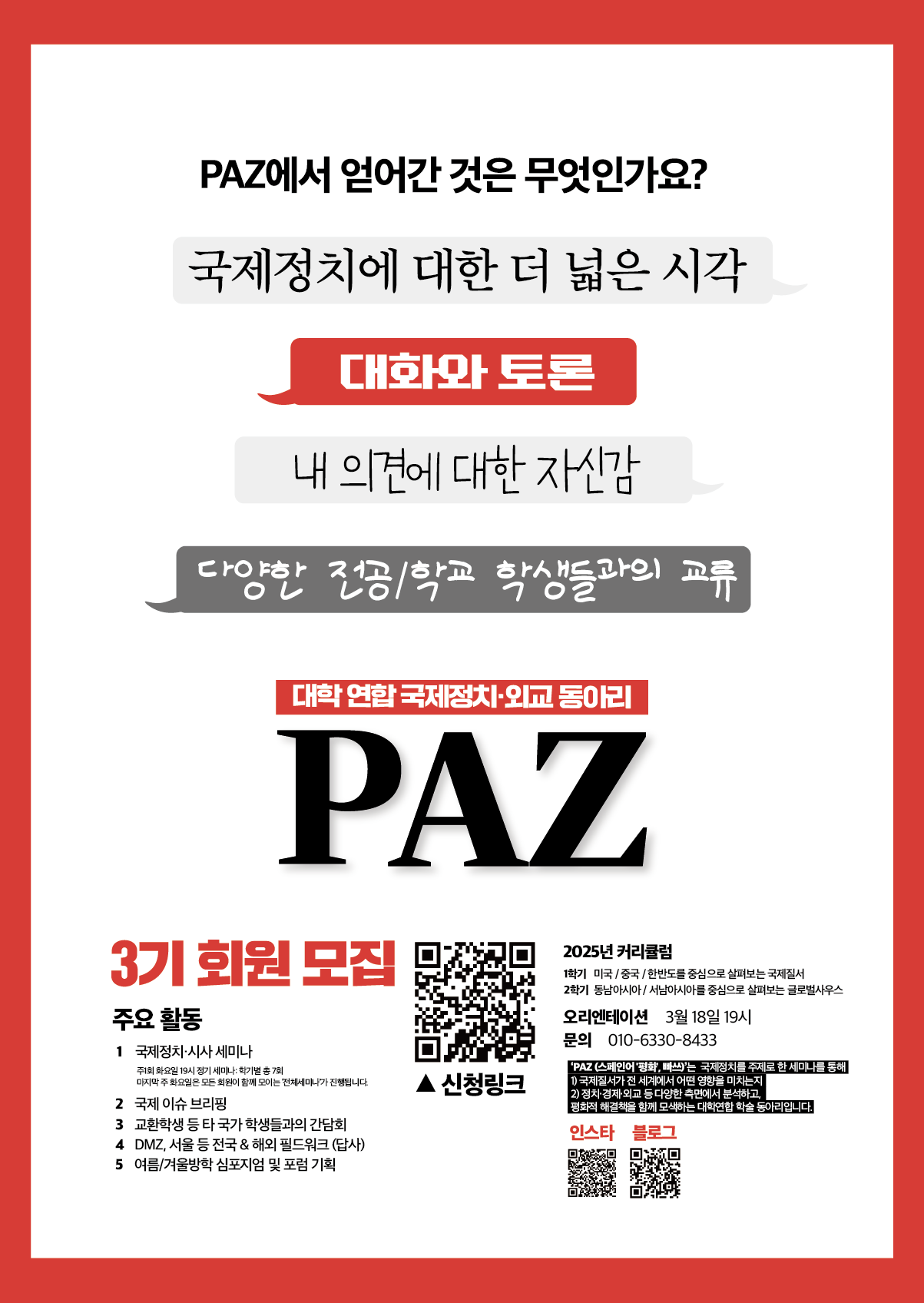 <대학 연합 국제정치·외교동아리 : Paz>에서 함께 할 3기 크루원을 모집합니다. ‘Paz’는 국제정치 이슈 세미나를 통해 국제질서가 전 세계에서 어떤 영향을 미치는지 정치﹒경제﹒외교 등 다양한 측면에서 분석하고, 평화적 해결책을 함께 모색하는 대학 연합 학술 동아리입니다. 국제뉴스부터 전공수업, 대외활동에도 도움이 되는 심도있는 내용까지 갖춘 PAZ에 많은 분들의 지원을 바랍니다!