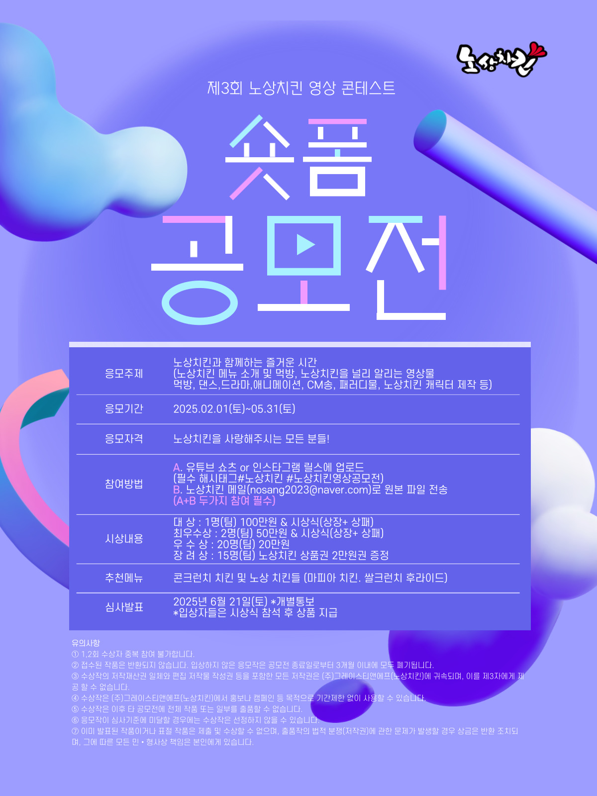 1. 응모주제 : 노상치킨과 함께하는 즐거운 시간(노상치킨 메뉴 소개 및 먹방, 노상치킨을 널리 알리는 영상물