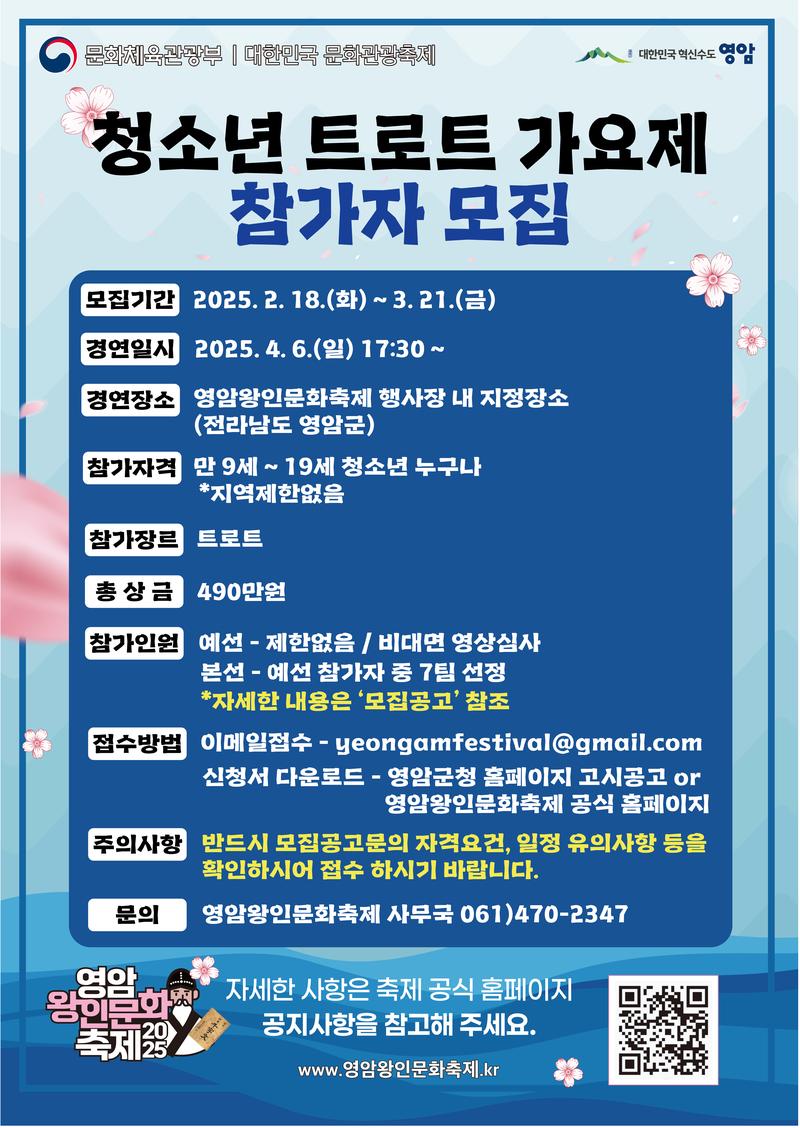 2025영암왕인문화축제 기간 진행되는 『청소년 트로트 가요제』 참가자를 아래와 같이 모집하오니 트로트를 사랑하는 청소년 여러분들의 많은 관심과 참여 바랍니다.