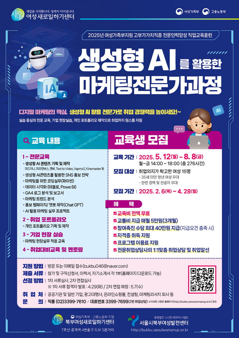 [여성가족부지원] 생성형 AI를 활용한 마케팅전문가 과정 교육생 모집 (국비무료교육+참여수당 지급)