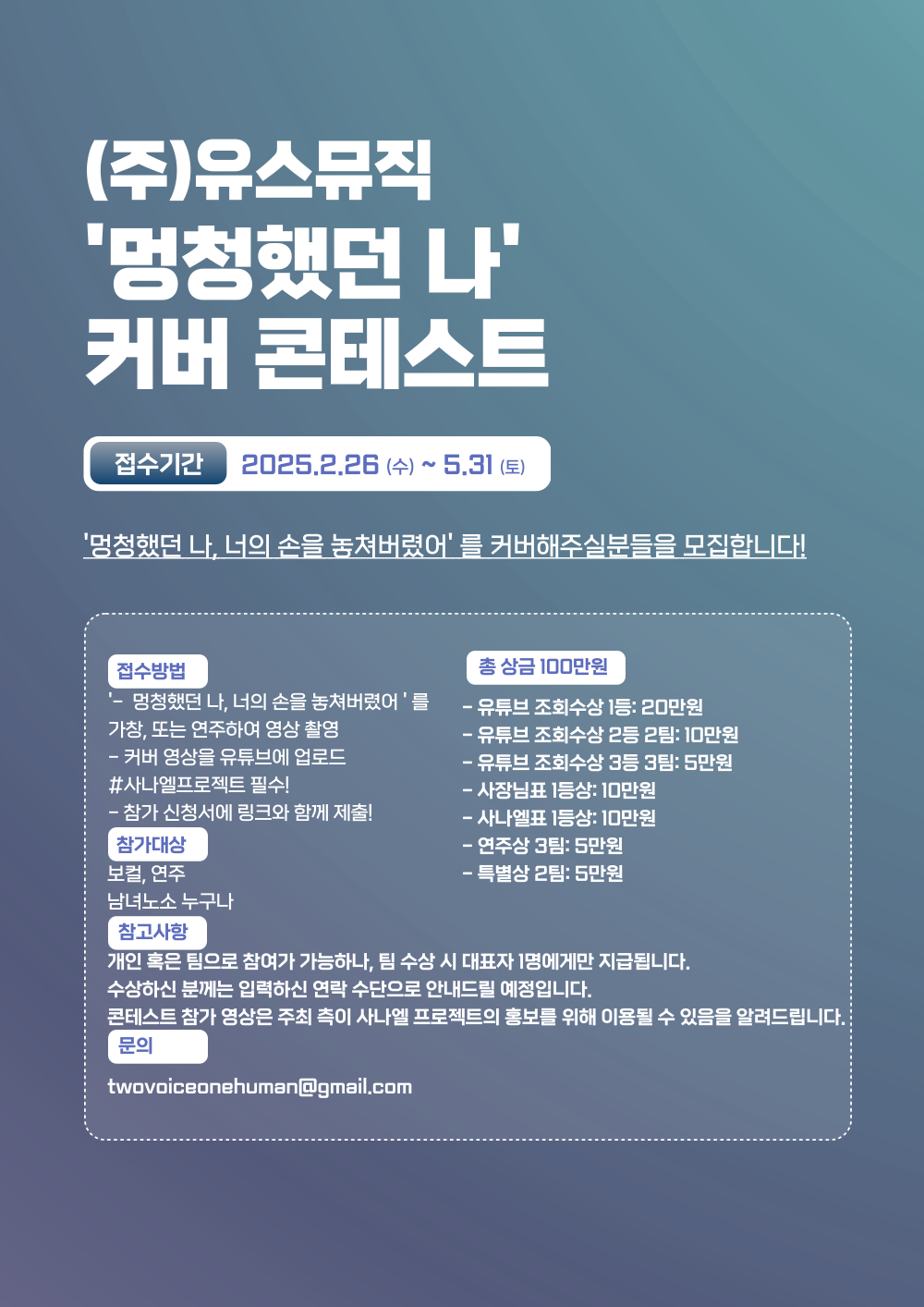 - 콘테스트 참가 영상은 주최 측이 사나엘 프로젝트의 홍보를 위해 이용될 수 있음을 알려드립니다.