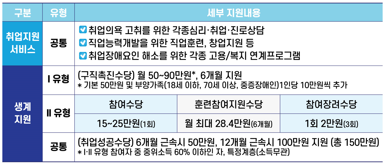 고용노동부에서 추진하는 사업으로 " 만 15세 ~ 69세"의 근로능력과 구직의사가 있는데도 취업이 어려운 분들께 취업지원서비스와 생계를 지원하여 구직활동과 생활안정을 지원하는 제도입니다.