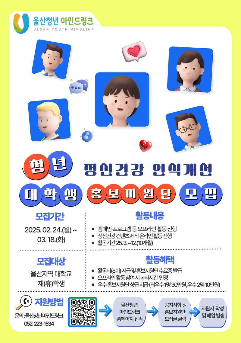 울산광역시 청년마음건강센터 울산청년 마인드링크에서는‘청년 정신건강 인식개선 대학생 홍보지원단’ 활동을 함께할 대학생(재·휴학생) 홍보지원단을 모집합니다.