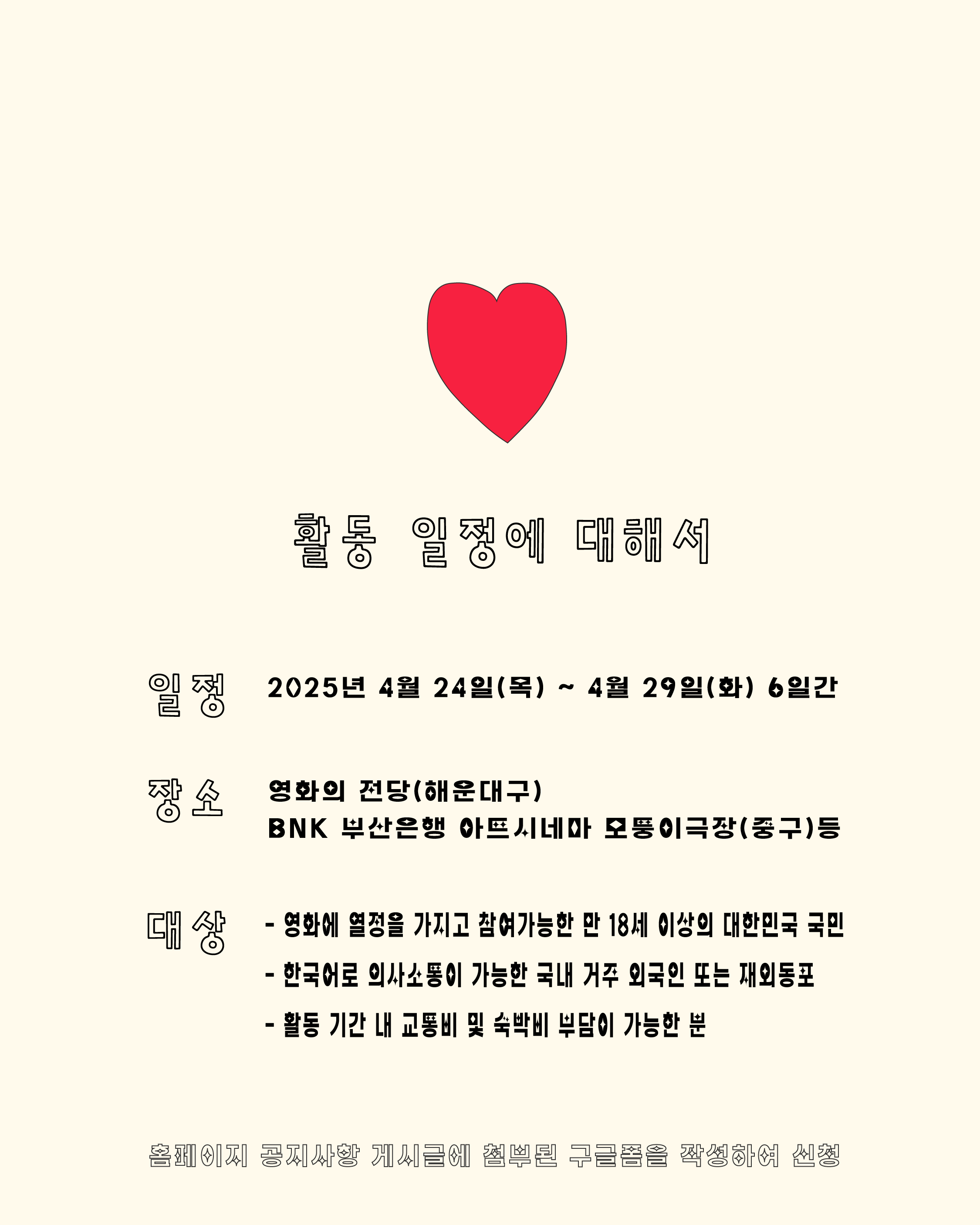 📍상세 안내: [모집] 2025 부산국제단편영화제 자원활동가 모집 (bisff.org)
