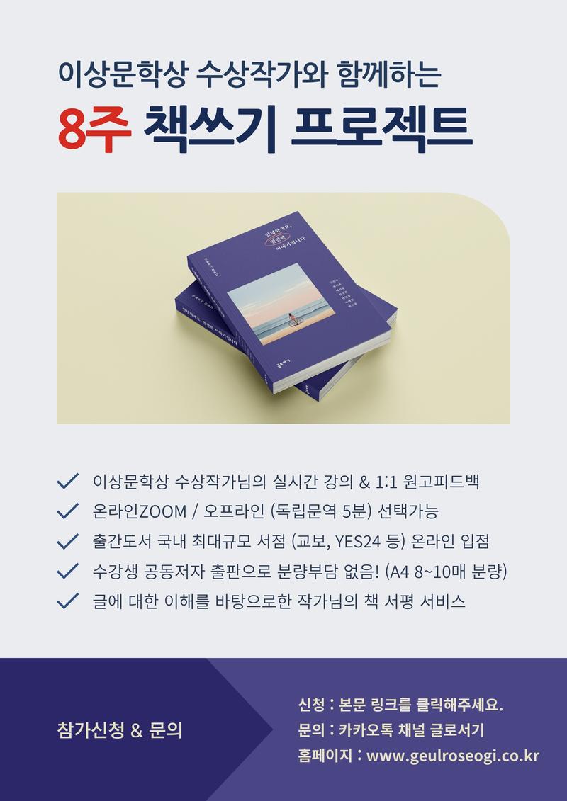 글로서기의 책쓰기 프로젝트는 8주간 문학적 글쓰기를 배우고 실제로 정식 도서까지 발간하는 문화생활입니다.