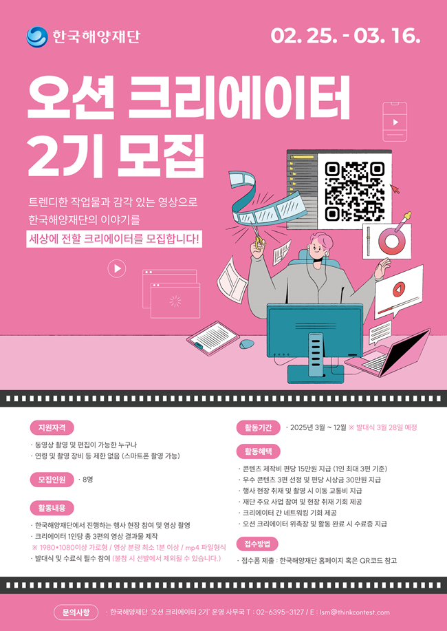 트렌디한 작업물, 감각있는 영상으로 한국해양재단의 이야기를 세상에 전할 크리에이터를 모집합니다!